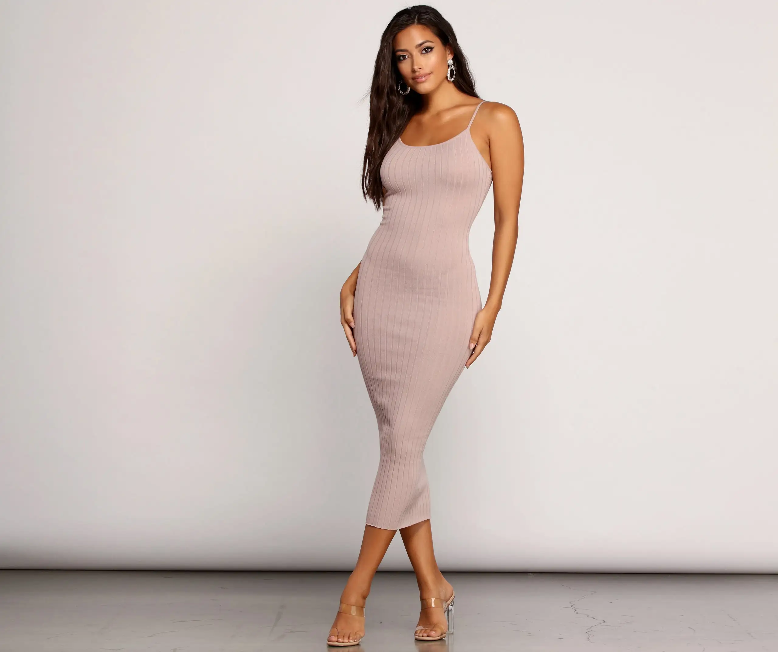 This adorable casual midi is not your basic knit dress. It features a sleeveless bodice, adjustable spaghetti straps, a scoop neckline, a square back, and a curve hugging, mid-length fit. The dress is composed of a wide ribbed sweater knit fabric that offers plenty of stretch.