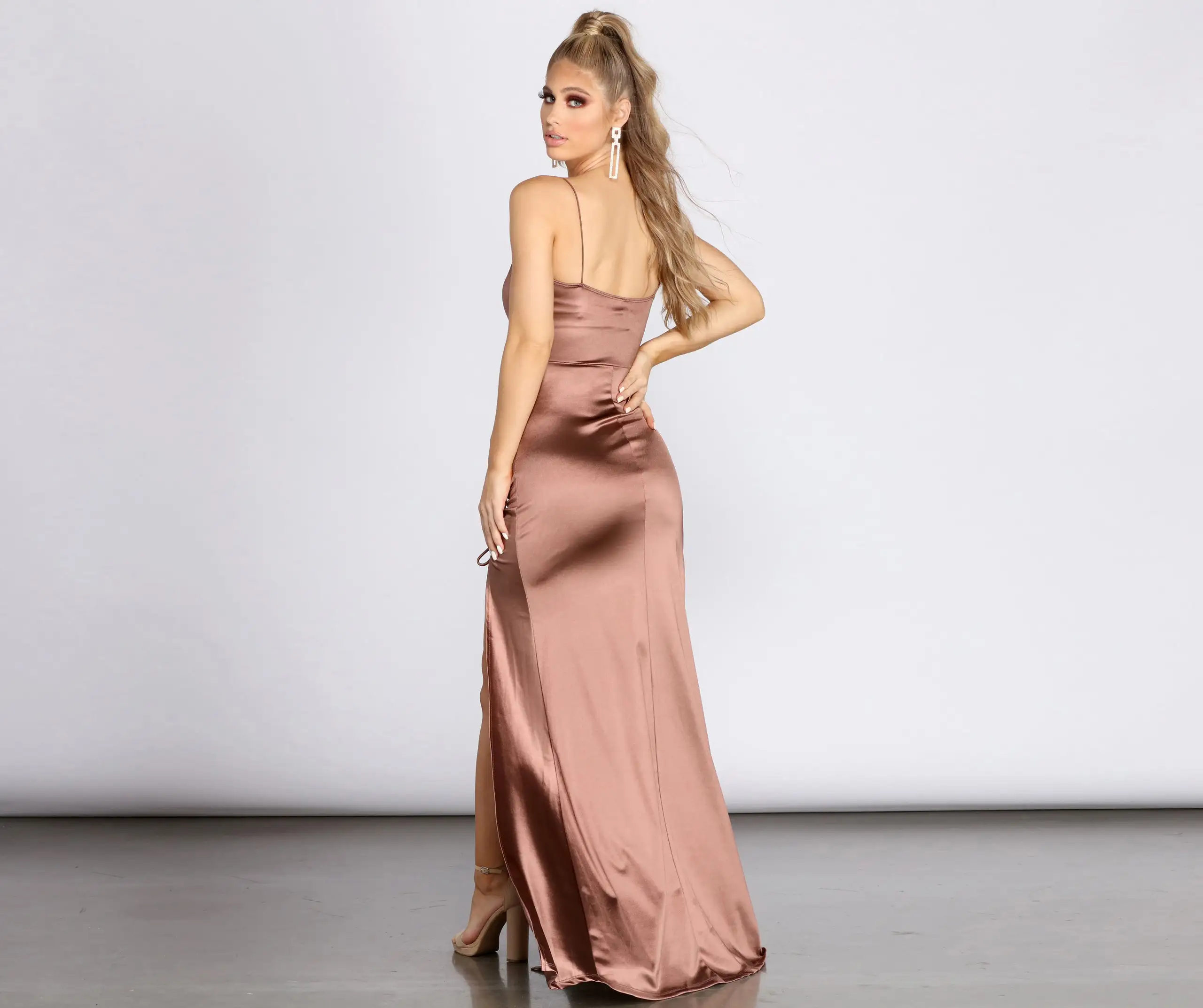 Let your arrival be known in our luxe Ksenia! Her satin sheen will light up any room and her thigh-high slit adds a flirty little touch.