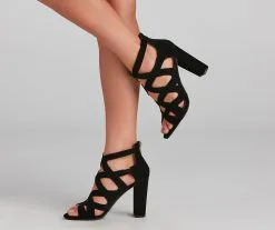 These nubuck booties will give you such a high-fashion look! They feature an open almond toe, closed block heel, back zipper closure, and a lattice design. Complete the look in a sleek m