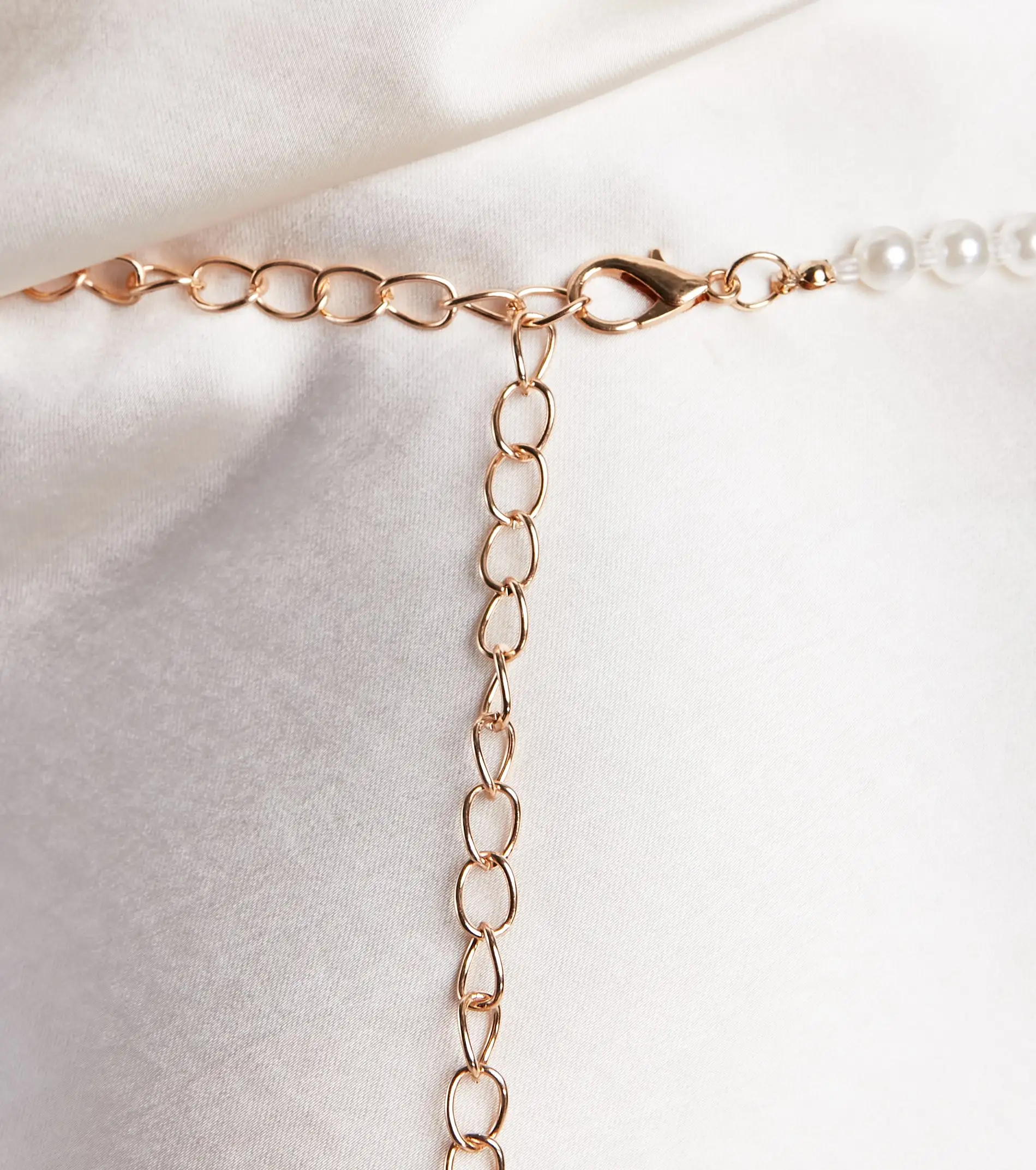 Layer on the glamorous vibes with this gorgeous pearl chain belt. It features a layered design with faux pearls, clear beads, and a center pearl accent with mini rhinestone detailing. The belt features an adjustable chain and lobster clasp closure. Style over a