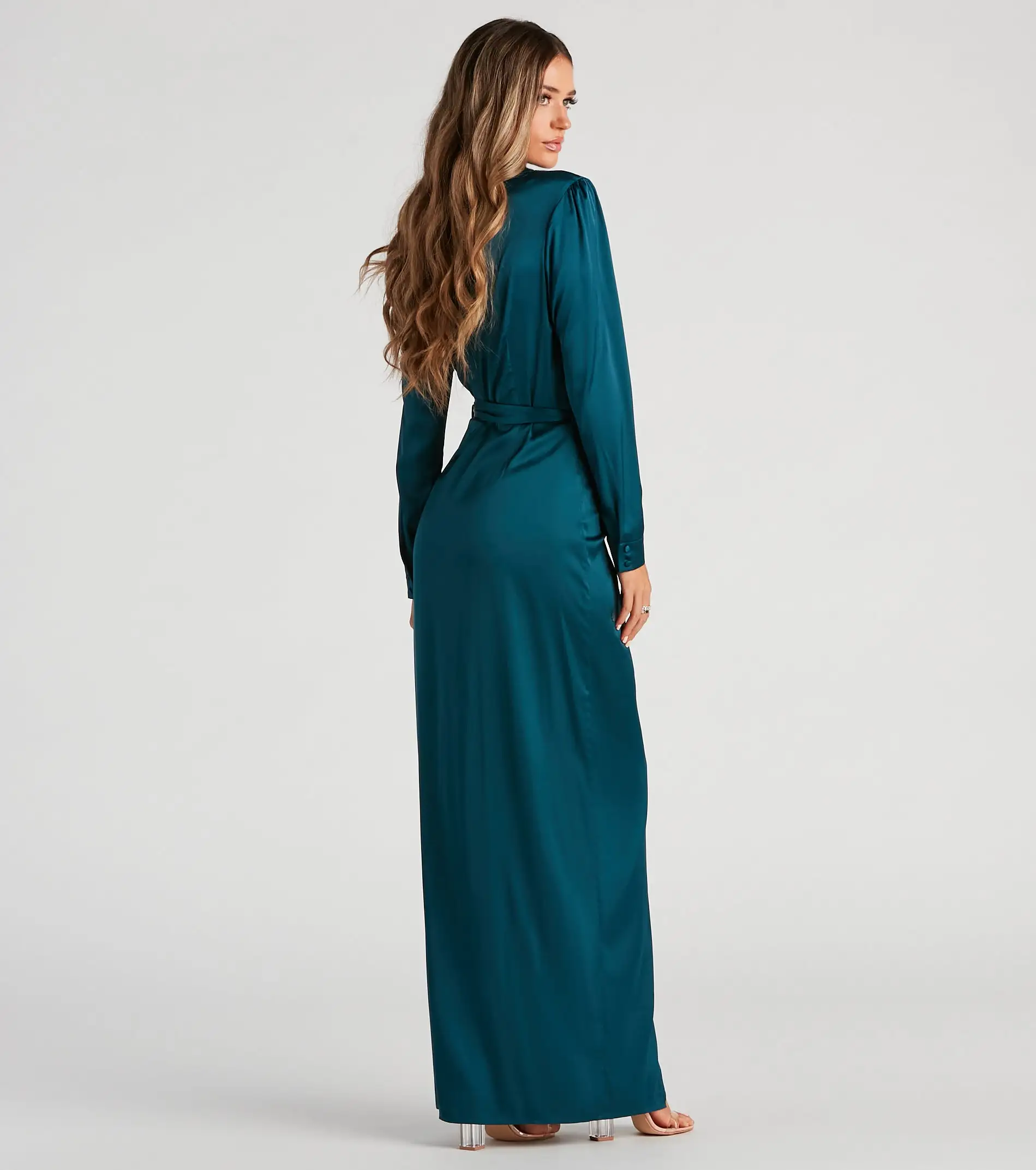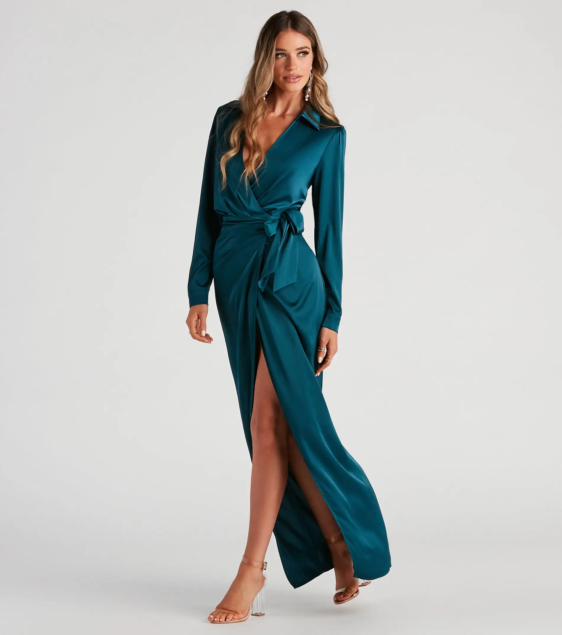 Silky and chic, the Leona satin formal dress will make you the best-dressed guest at your next wedding. She features a classic collared V-neckline with a wrap-front design, long sleeves with button details, an adorable tie waist design with ruched detailing, and a floor-length wrap-front skirt with a high front slit and a flowy silhouette. The smooth satin fabric offers a lightweight feel. Complete the look with