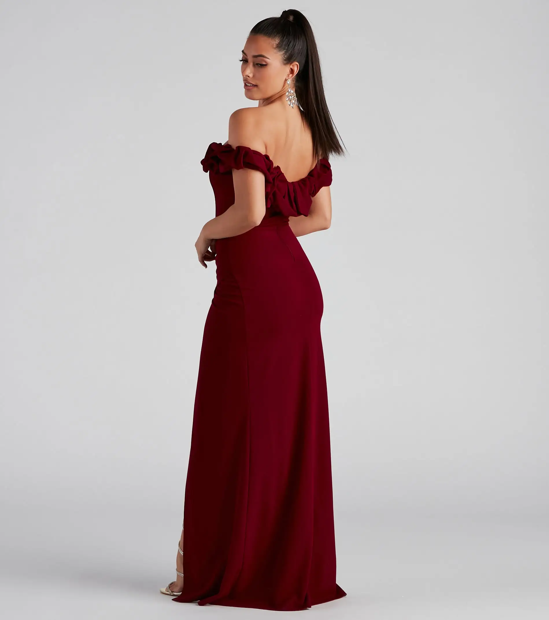 Showcase elegance and glamour in the Leslie crepe mermaid dress. She features an off-the-shoulder neckline with a chic detailed overlay, short puff sleeves, a high waist seam with side pleated detailing, and a faux wrap floor-length skirt with a front slit and a mermaid silhouette. Style this dress with rhinestone earrings and