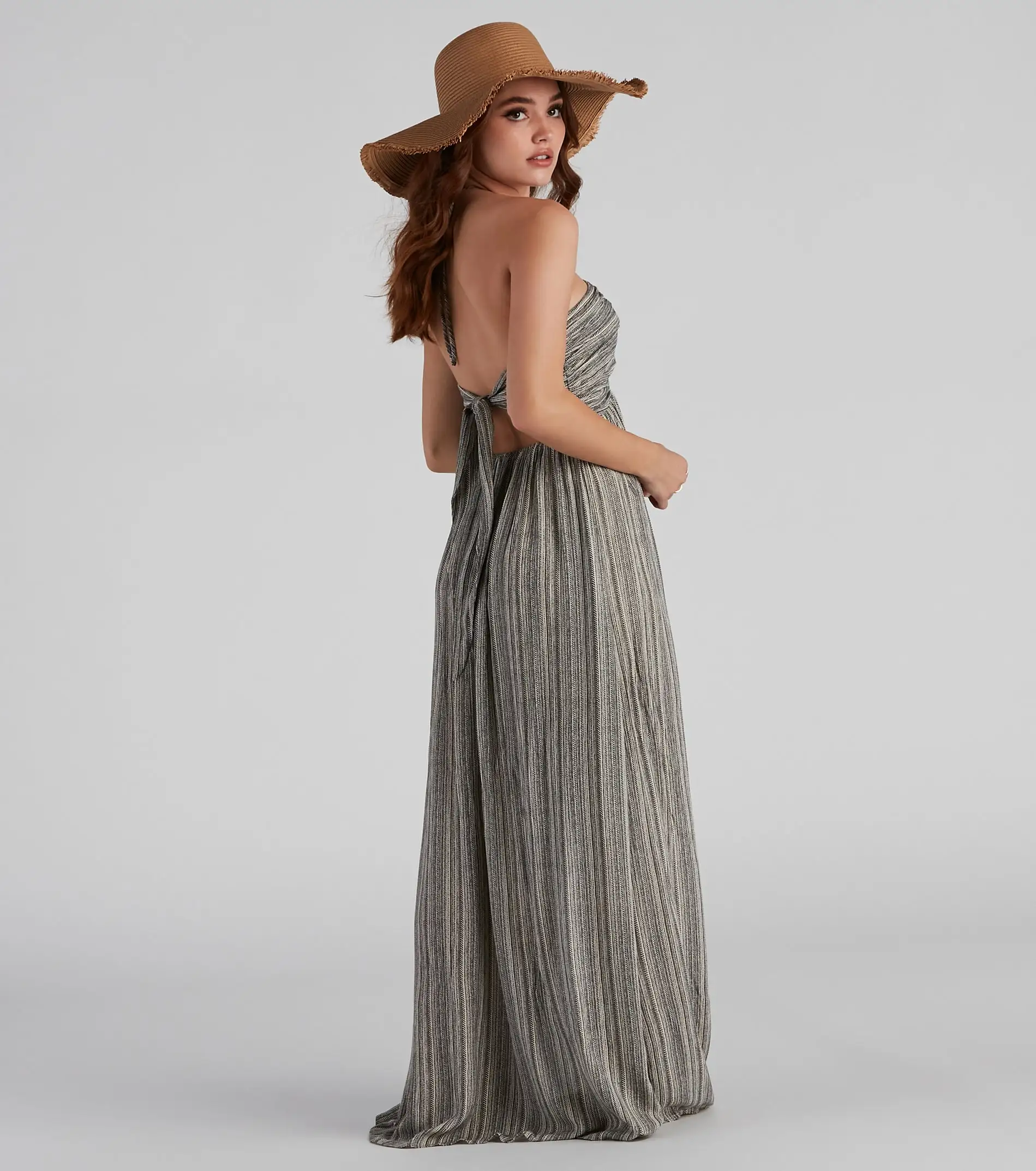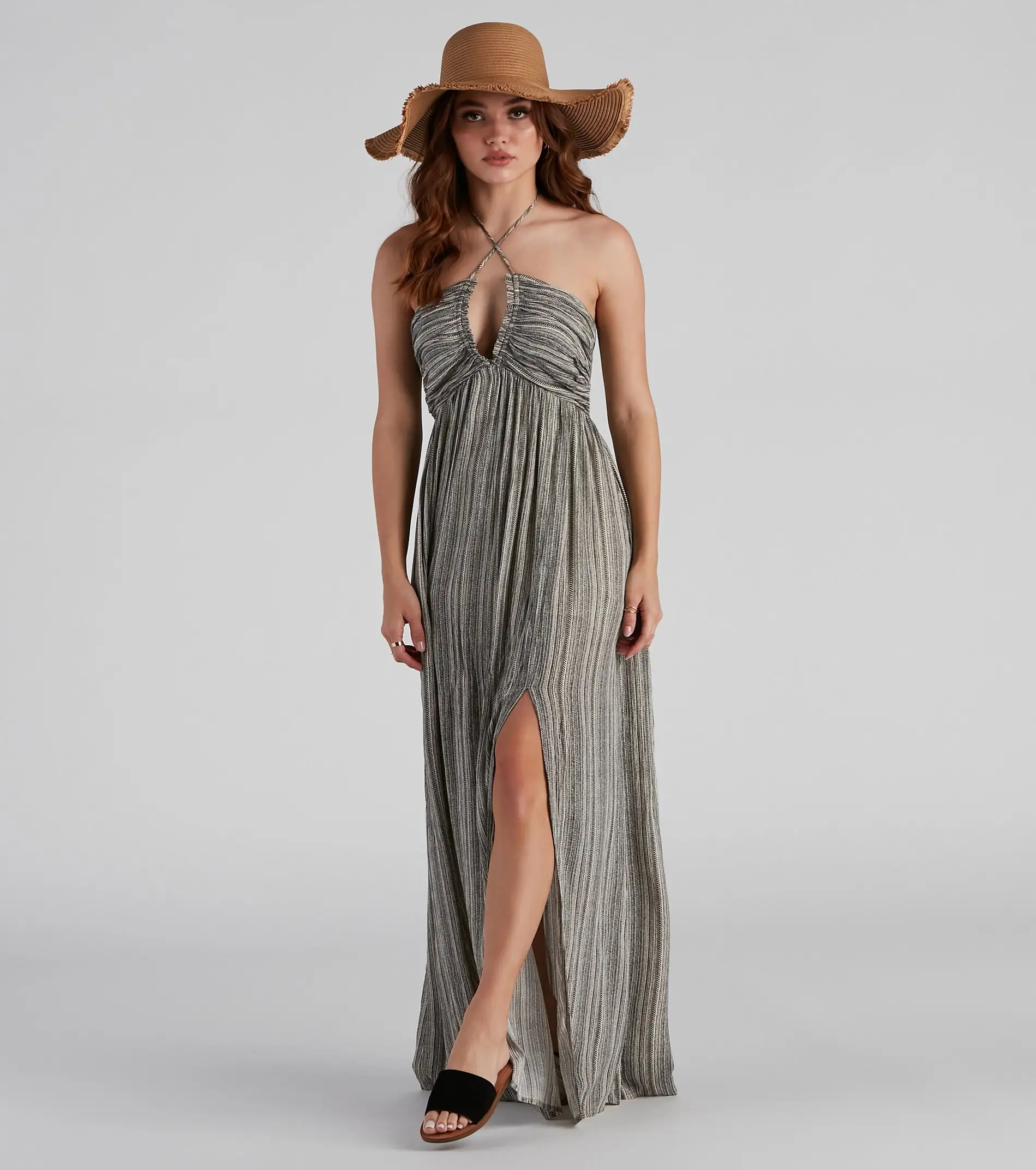 Look effortlessly put together in this breezy striped linen maxi dress for a Duffy boat cruise or beachside brunch! It features a sleeveless, halter v-neck with tie-closure, a partial open-back with tie, hidden side pockets, and a flowy, maxi-length silhouette with a sultry front slit. Complete the look in a straw floppy hat and sandals.Â