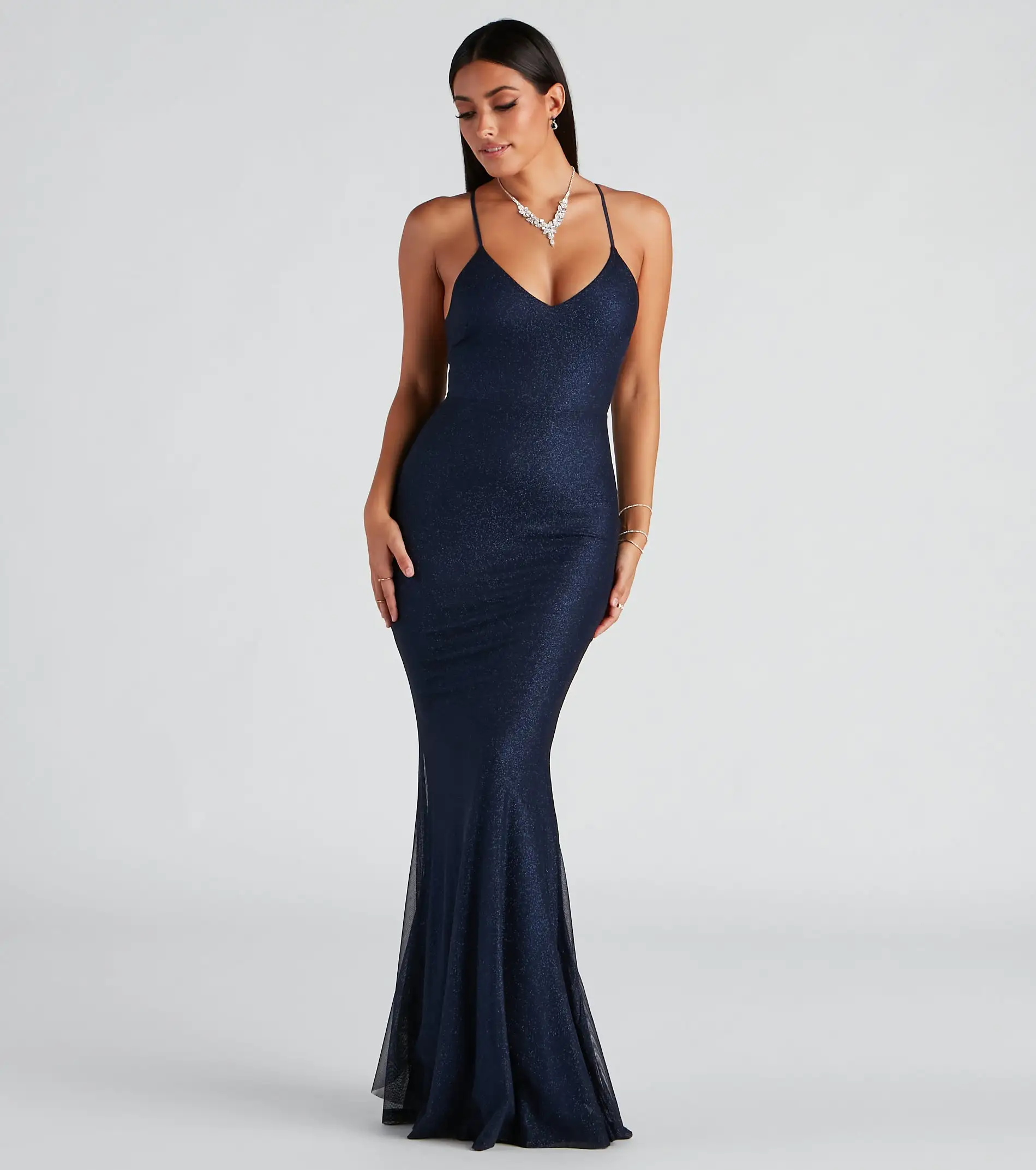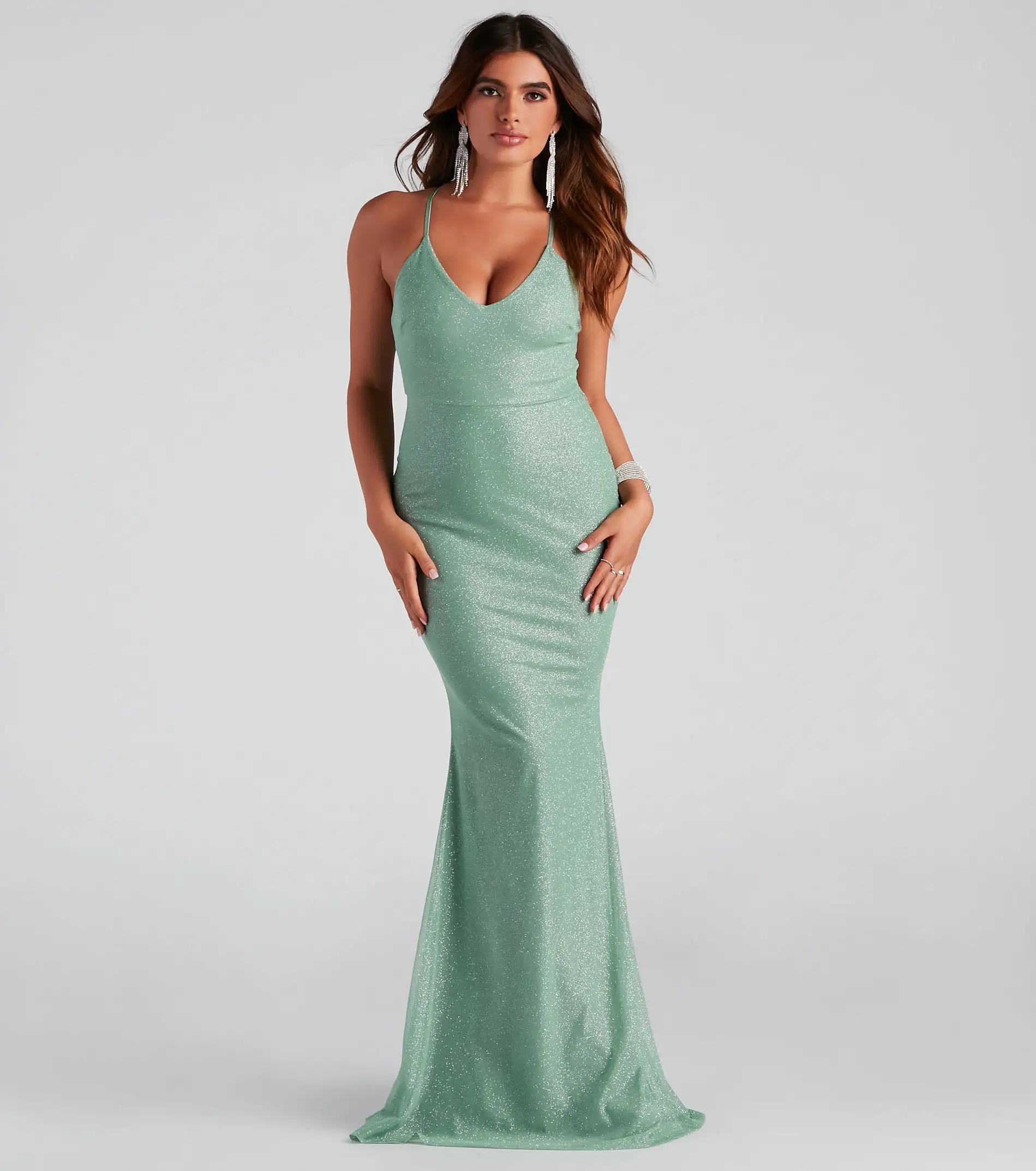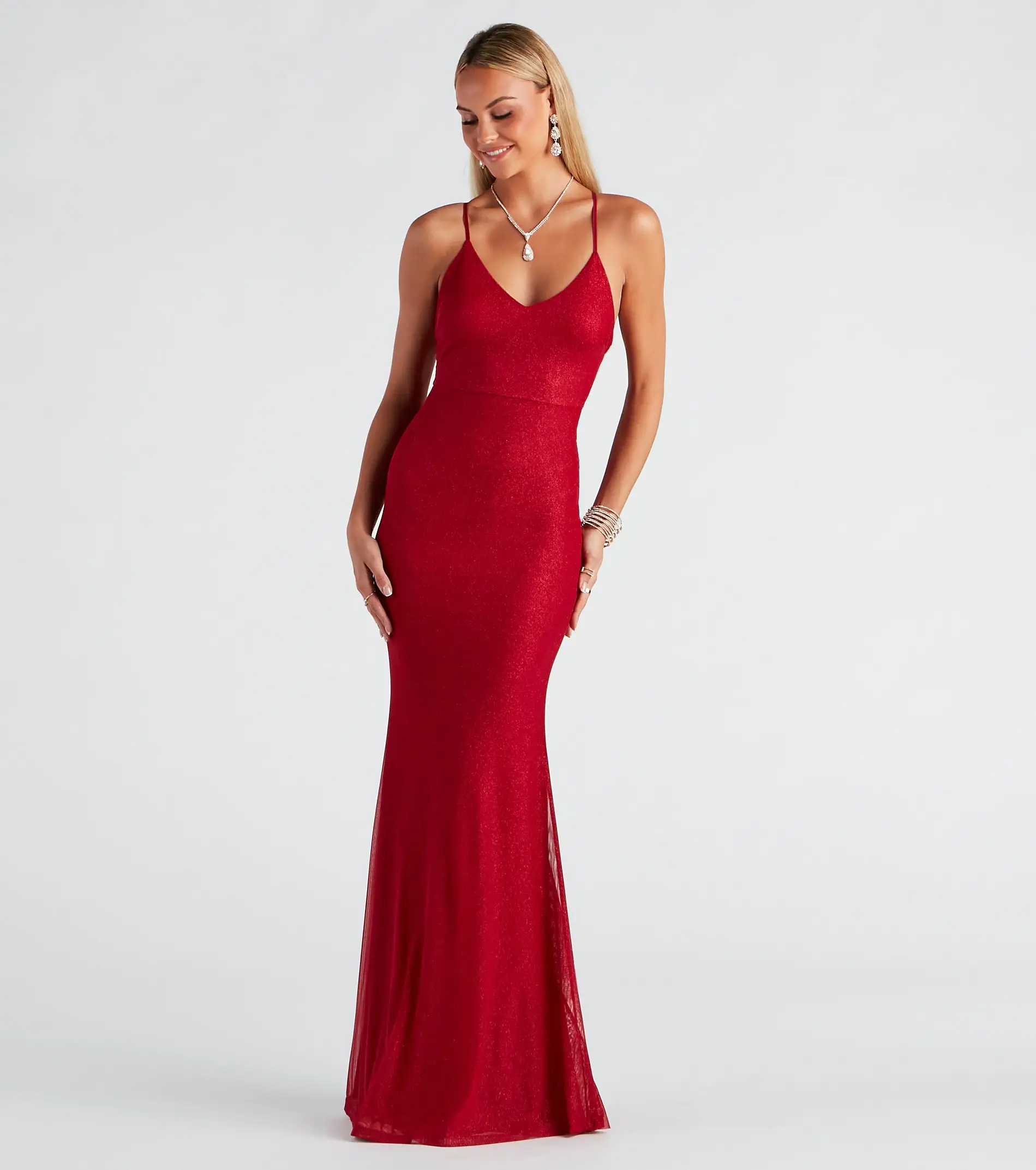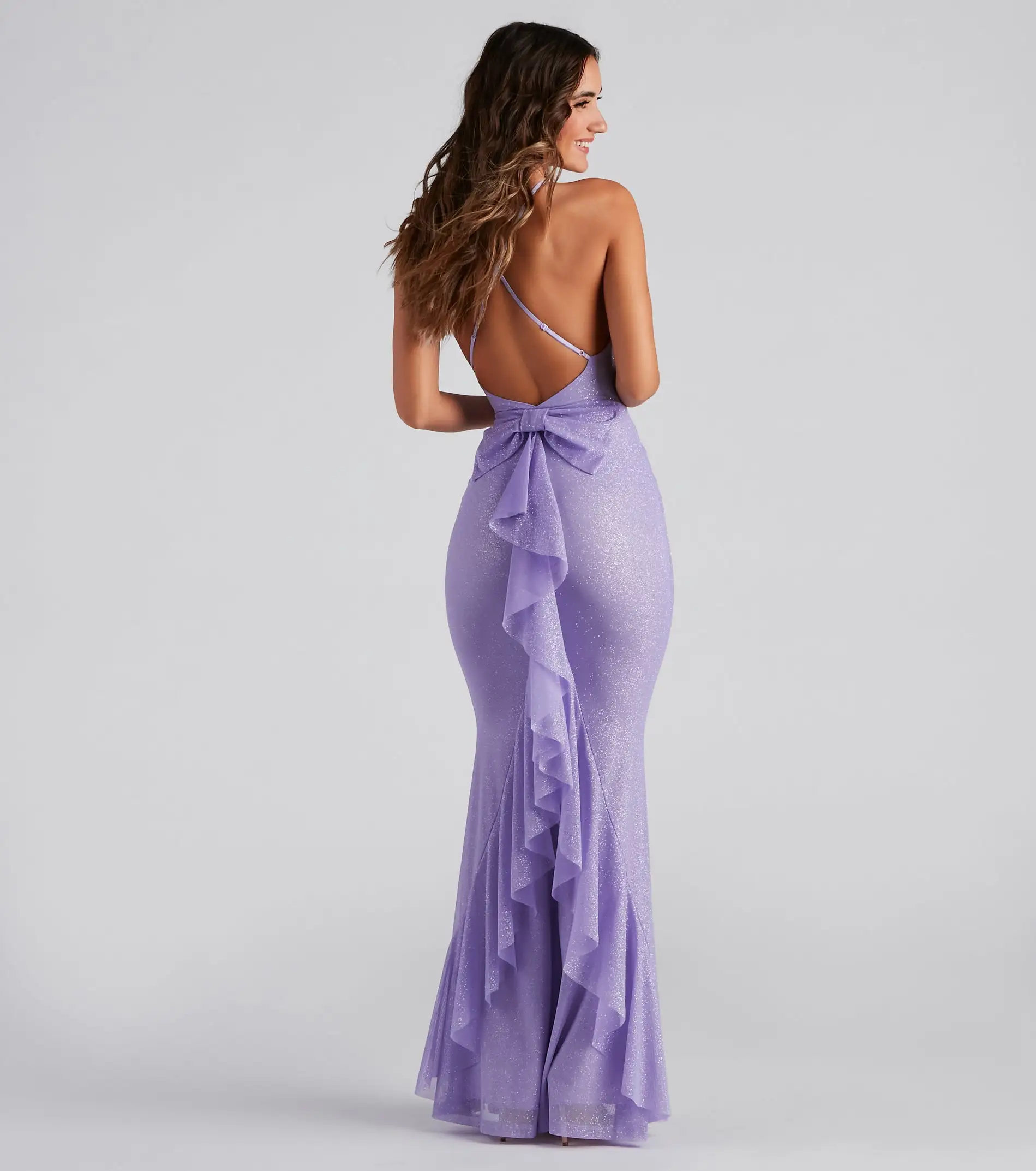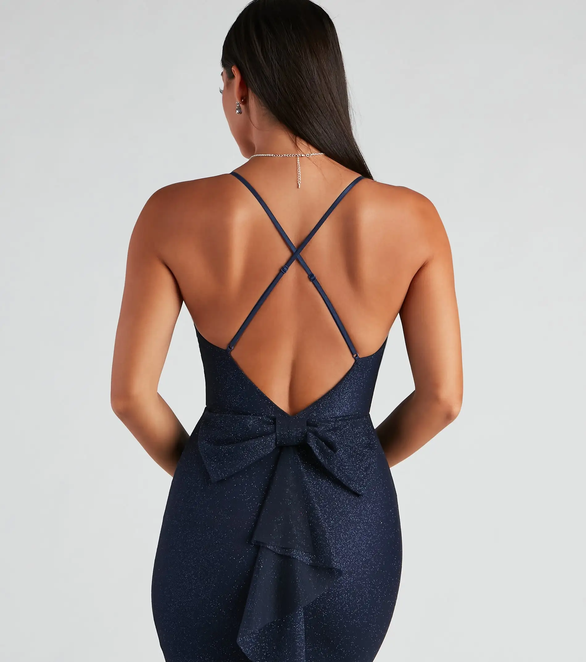 Bring the sparkle with a formal dress that brings the glitz! The dress features a sleeveless V-neckline with adjustable spaghetti straps, an alluring open back with criss-cross straps, and a bow accent that sits atop cascading ruffles on a mermaid silhouette. The dress is composed of lined glitter knit fabric that offers a form-hugging fit with minimal stretch. Complete the look with