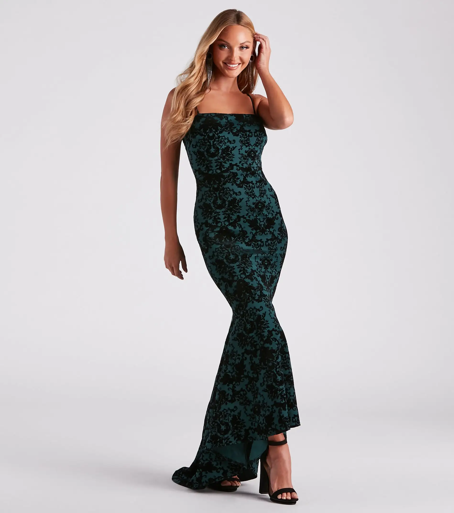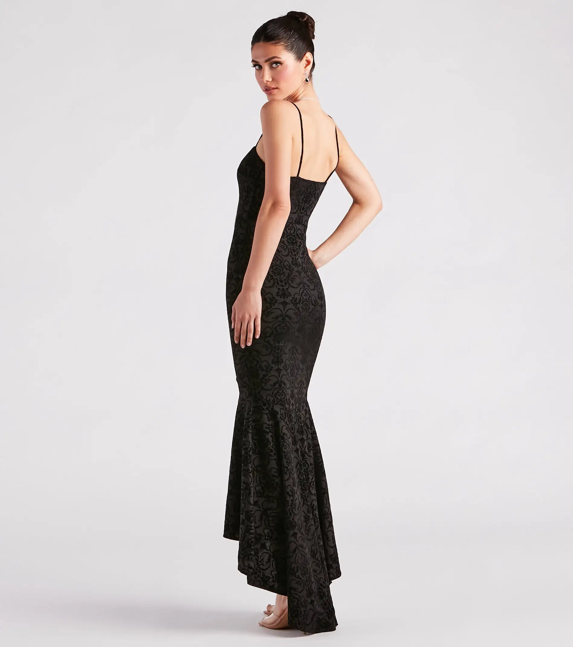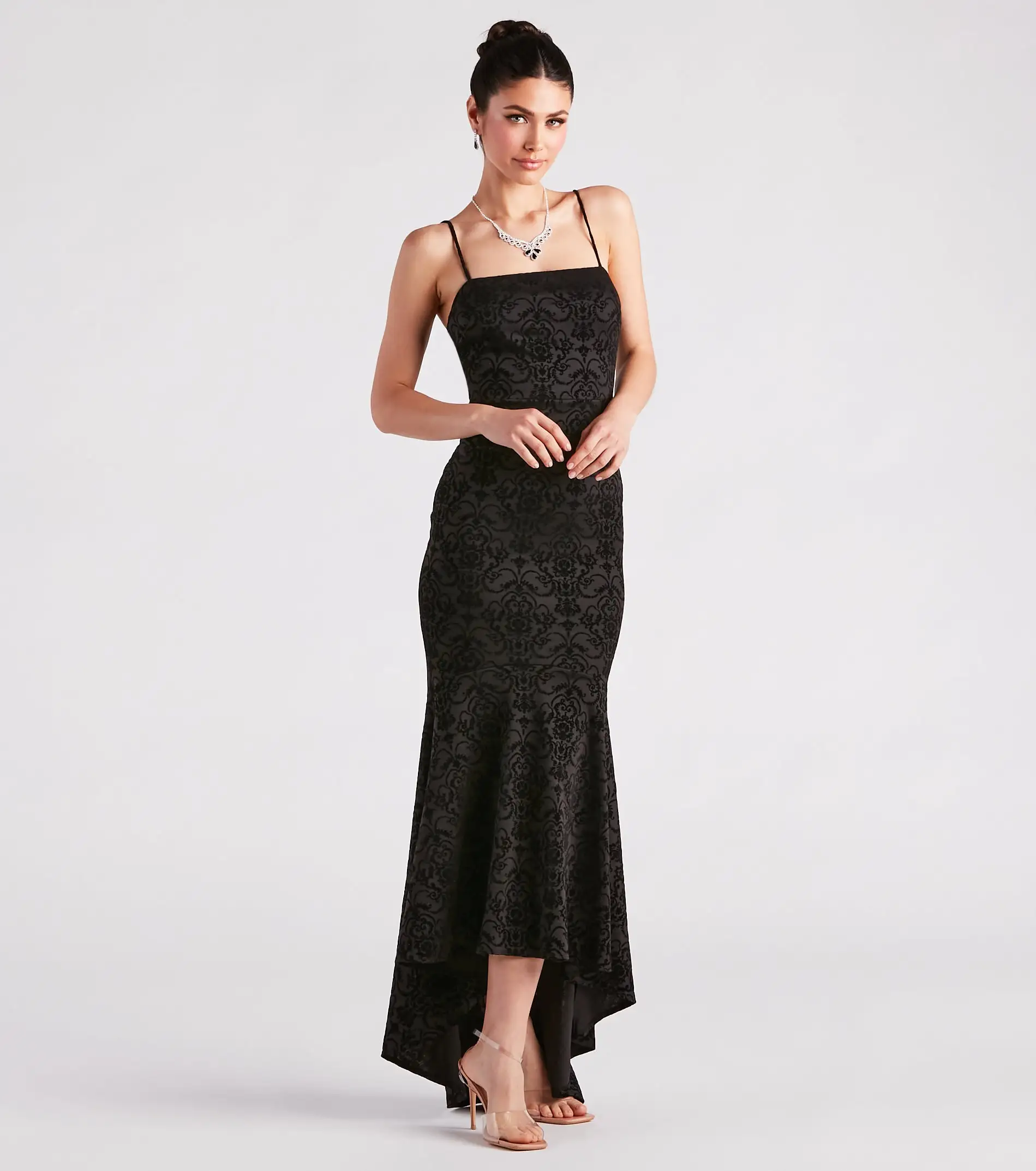 Leave every room making people’s jaws drop in the sophisticated and sultry Liyah formal dress perfect for holiday balls or winter weddings! She features a classic sleeveless square neckline, bust lining, spaghetti straps, and a high-waist seam that leads to her form-hugging, mermaid silhouette, and ruffled high-low hem. The formal dress is composed of a woven fabric with a flocked velvet pattern and minimal stretch. Style with a