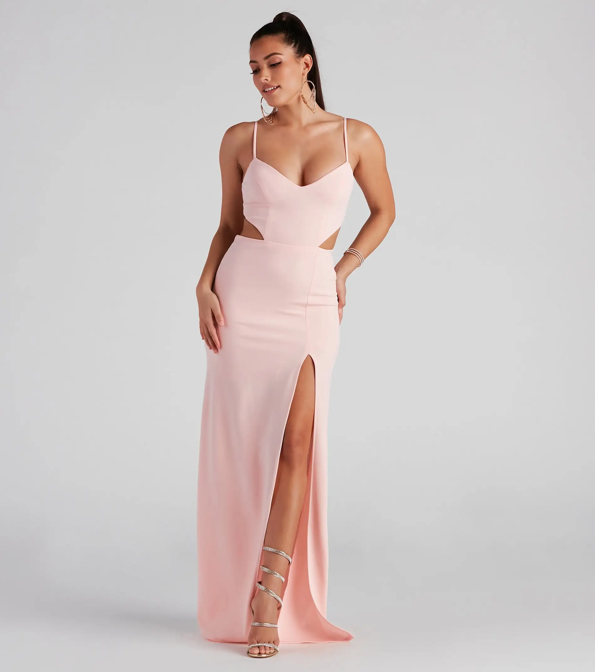 Showcase your fab figure in the Liz formal dress for your next dressy occasion! She brings all the sultry vibes in her sleek, sleeveless, v-neckline with adjustable spaghetti straps and a cutout bodice that leads to her floor-length hem with a sexy front slit. The formal dress is composed of stretch-crepe fabric with an inner lining. Complete your dressy look with rhinestone strappy