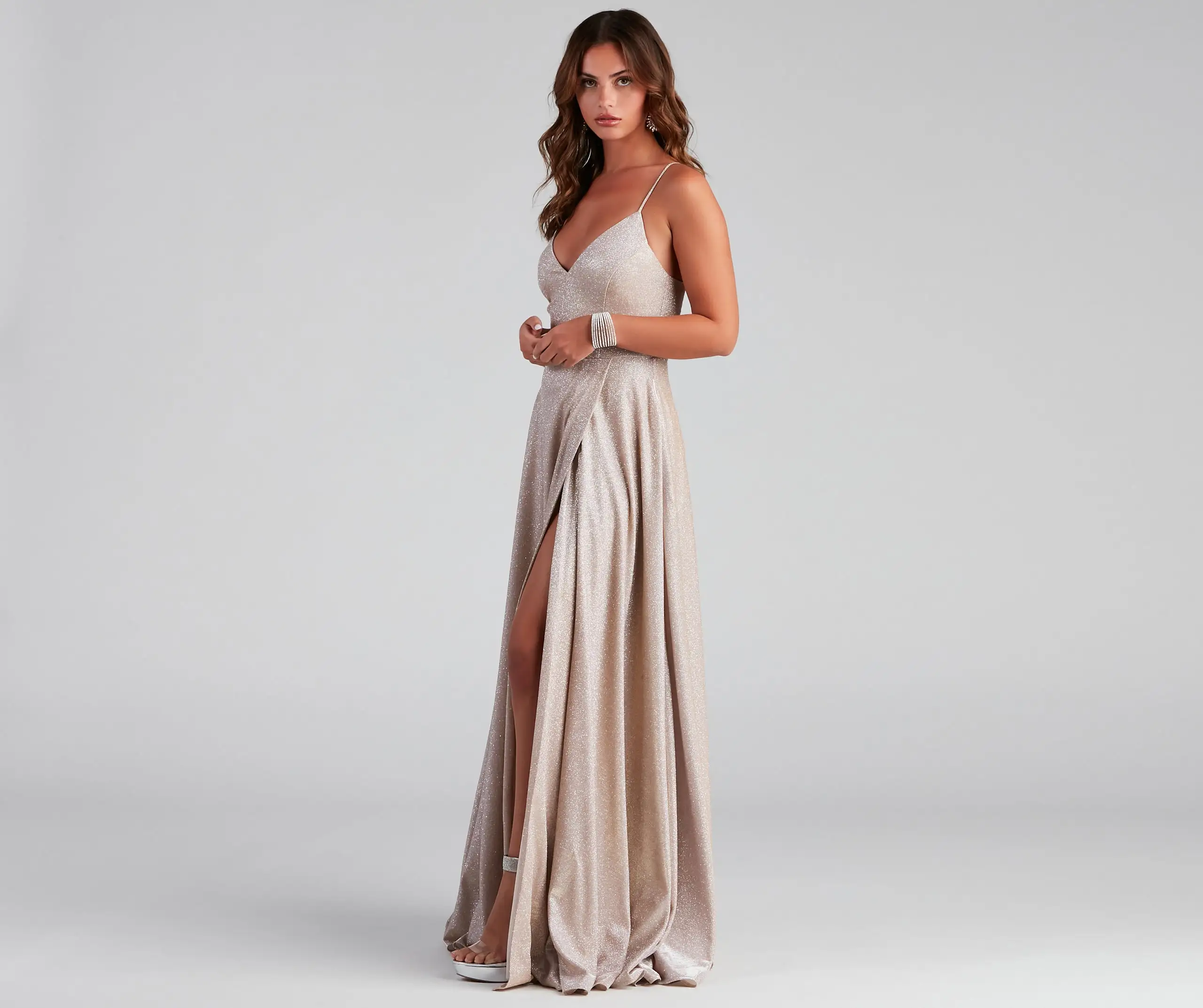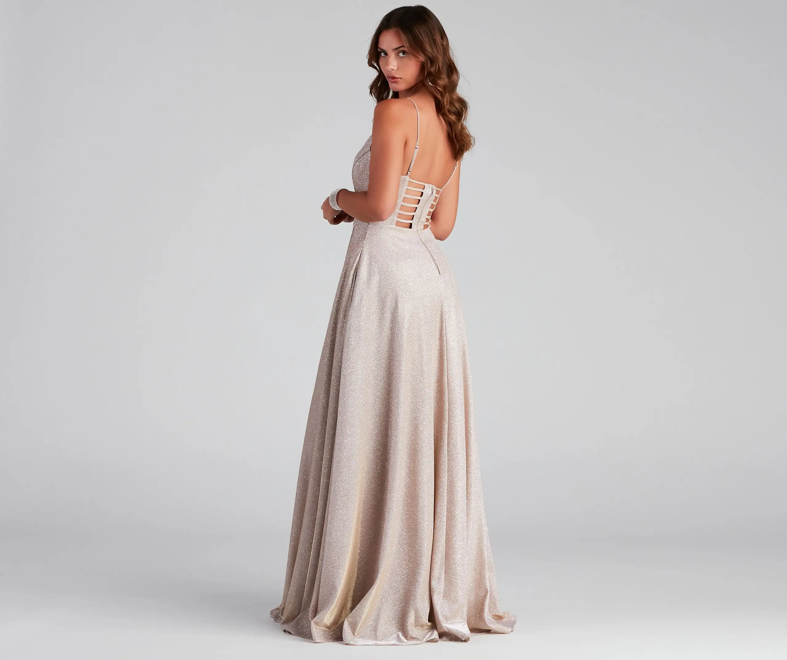 Sparkly and sultry, the Lizzie glitter formal dress is designed to captivate every guest at prom! She stuns in a classy, sleeveless, V-neckline, princess seams on the bodice, adjustable spaghetti straps so you can customize her fit, and side pockets perfect for keeping your hands warm. Make heads turn everywhere you go thanks to the caged-back detail that radiates a femme allure atop the A-line silhouette that effortlessly kisses the floor and features a sexy high-cut front slit. Complete your prom look in elegant