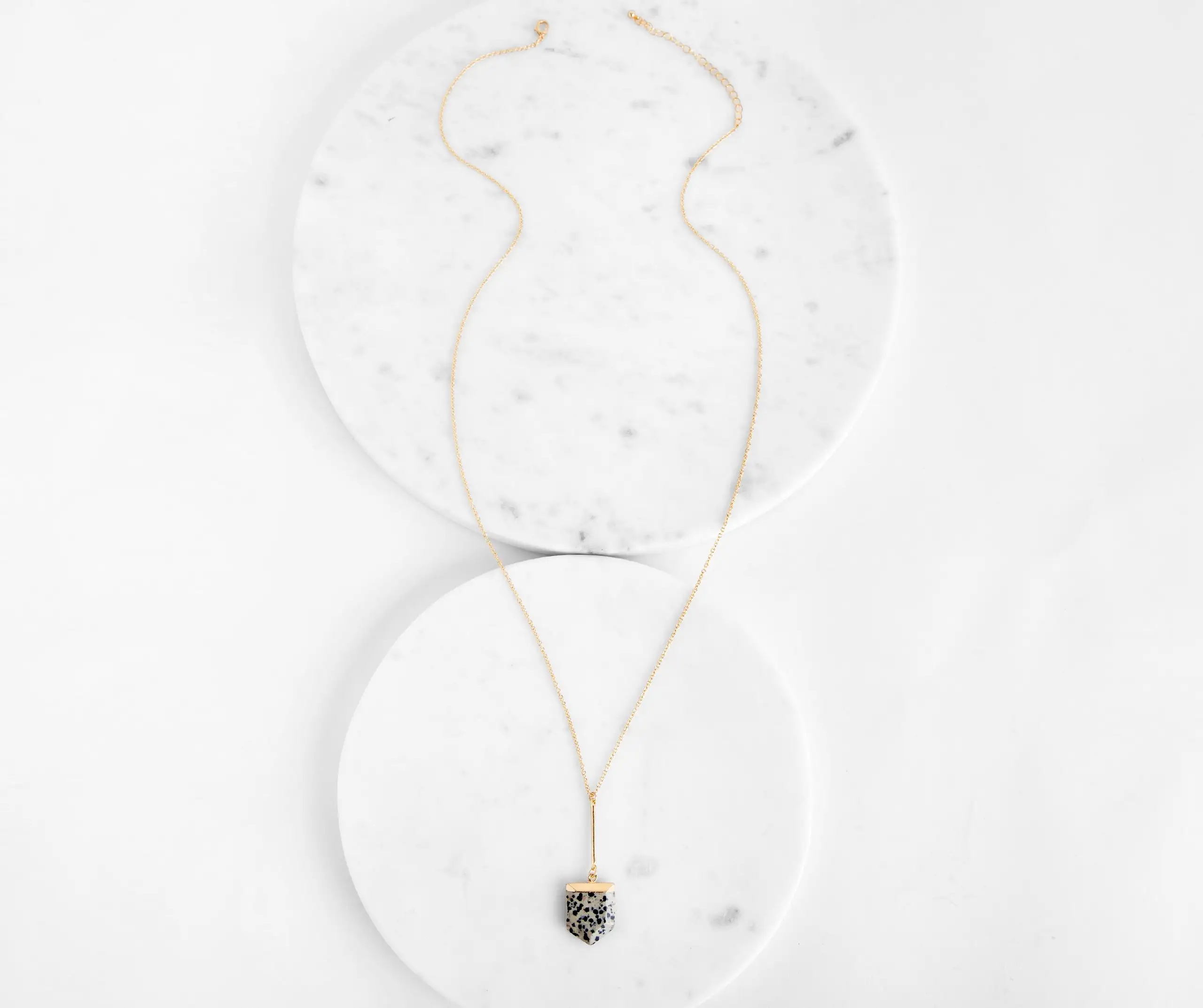 For the boho babe, This long necklace showcases a beautiful neutral dalmatian stone pendant. Stone is pointed at the end and dangles from a bar detailing. Layer with shorter necklaces or let the stone be the star of the show. Either way gives off that boho vibe we are loving for all seasons.