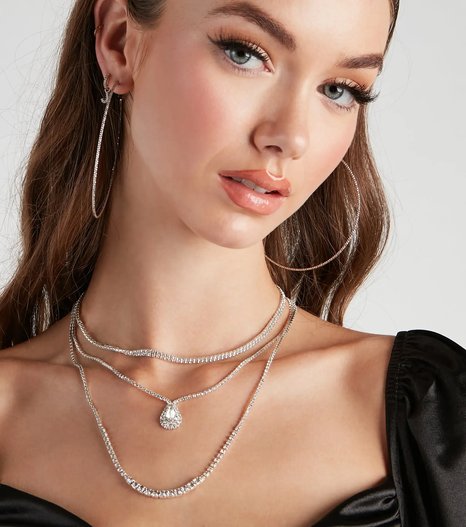 ! It features three rhinestone layers, a teardrop charm, and a lobster clasp closure.