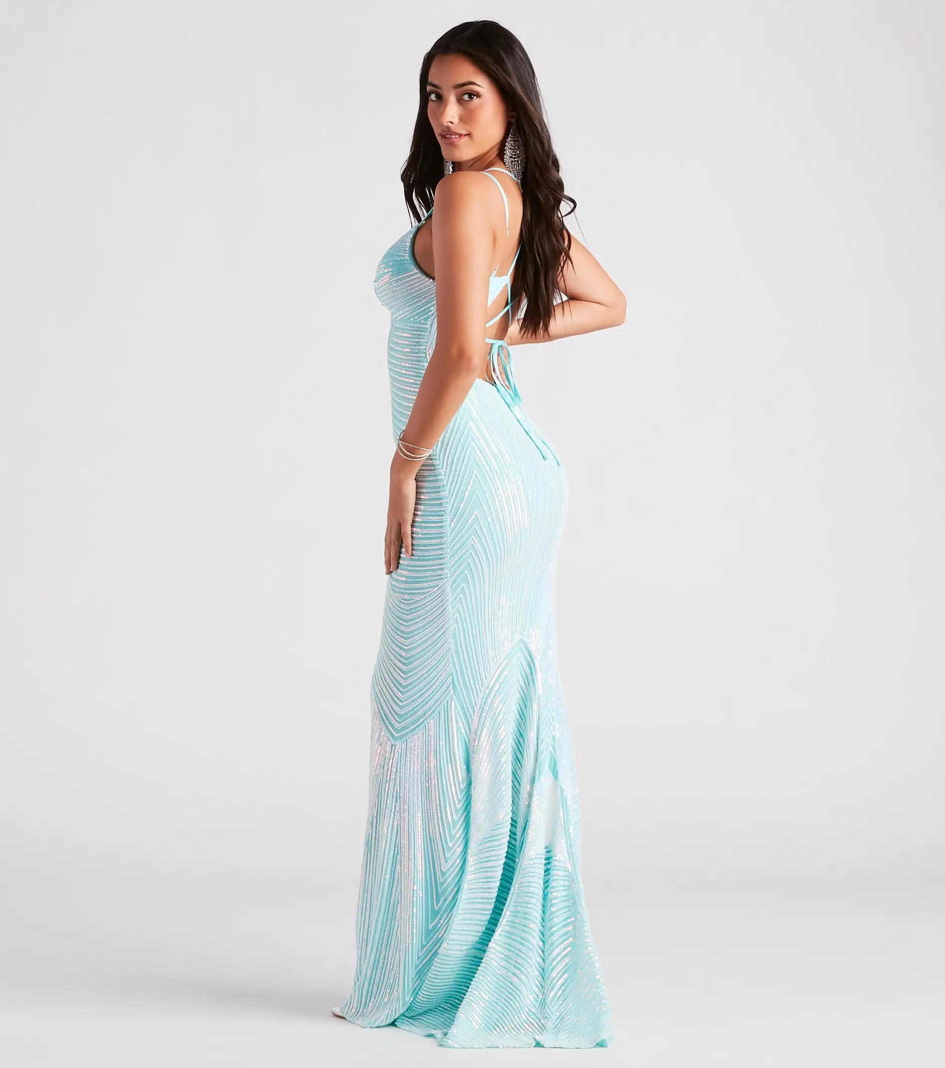Dazzle with glitz and glamorous vibes in the stunning Lyanna formal sequin dress! She features a sleeveless V-neckline with a built-in padded bust, spaghetti straps, a bold open back with a cross-back, lace-up strappy design, a fitted bodice and hip-hugging fit, and a floor-length hem with a mermaid silhouette. The lined mesh fabric showcases iridescent sequin embroidery in an intricate geometric design. Style with a
