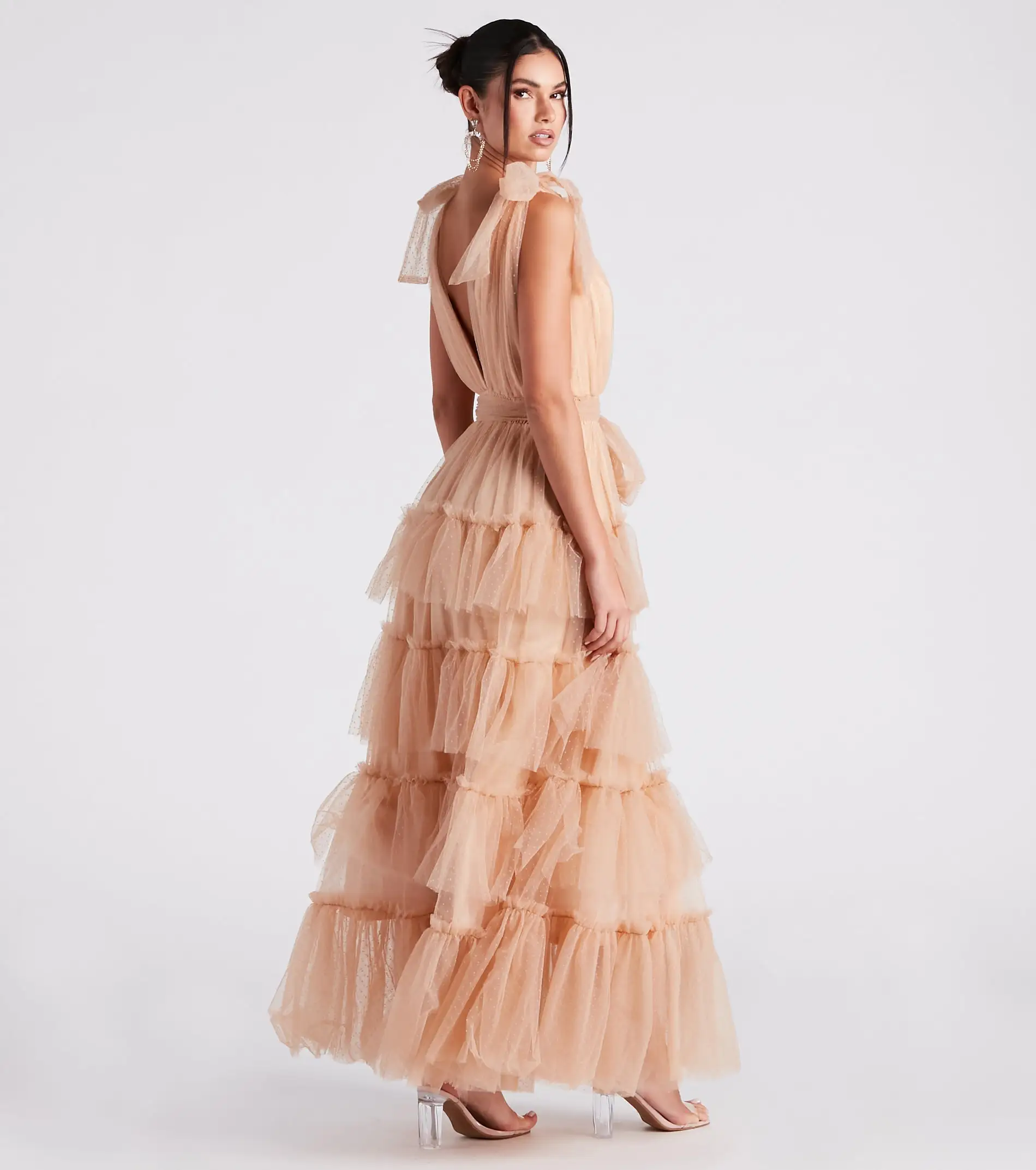 Romance is in the air as you breeze in wearing the Mabelle formal dress to the dinner party or gala! She features a sweet A-line silhouette designed with a sleeveless plunge V-neckline with tie-knotted straps, a V-cut back design, and a smocked empire waist with a tie-front belt and belt loops that lead to her ruffled, tiered, long-length hem. The formal dress is composed of a swiss dot tulle fabric with multiple linings for a voluminous effect and has a minimal stretch. Style with an