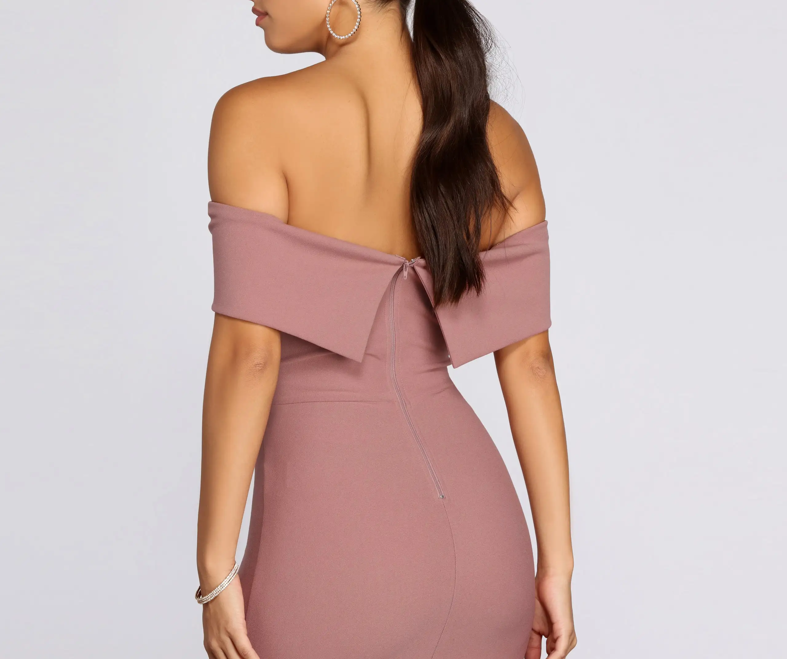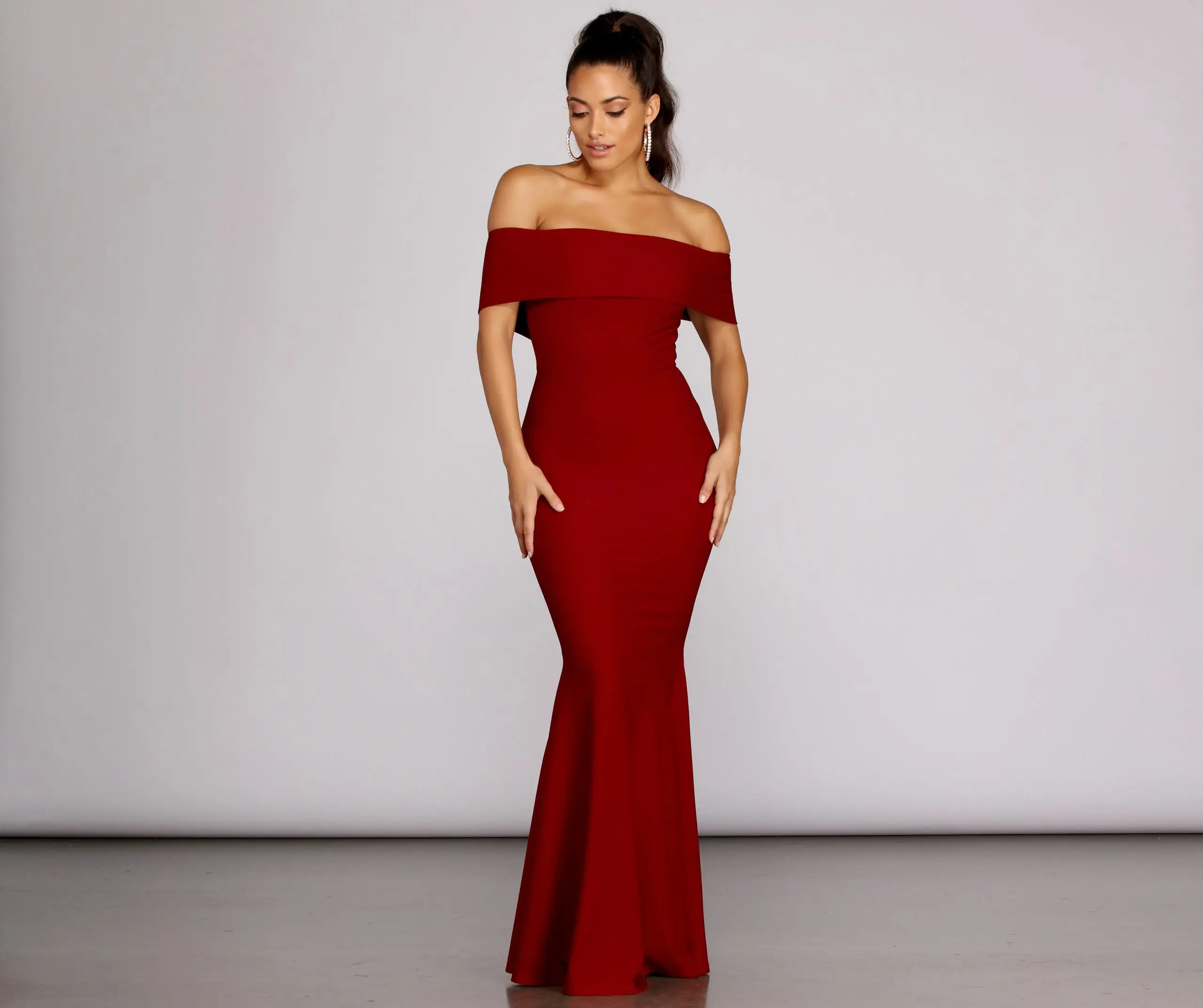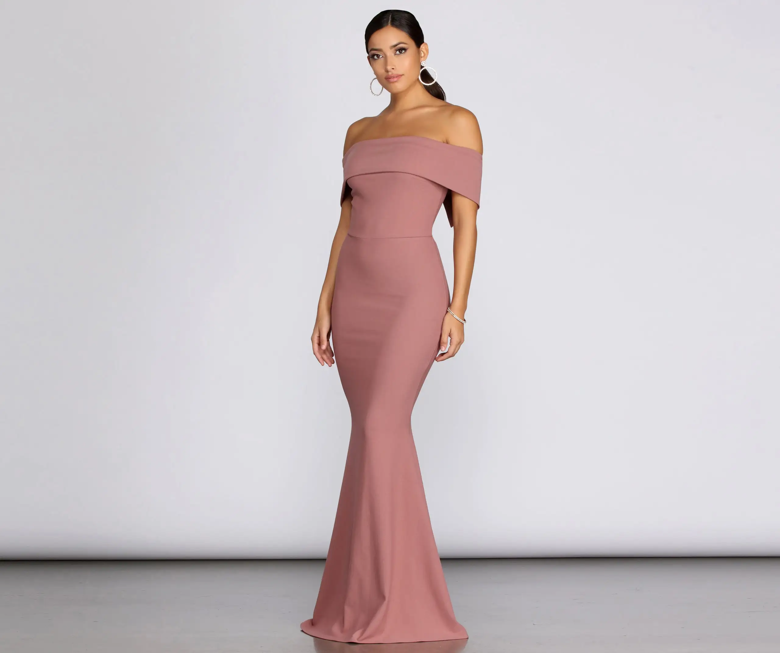 Stun in a formal mermaid dress that radiates elegance and grace. Captivate with a sleek, timeless style for your next special event in a dress that brings glamour. The Maddison formal dress features an off-the-shoulder neckline with a fold-over accent and vertical princess seams at the bust that provides structure. The relaxed fit bodice leads to a curve-hugging mermaid silhouette that flatters curves by creating an hourglass illusion. Complete your elegant formal outfit with a
