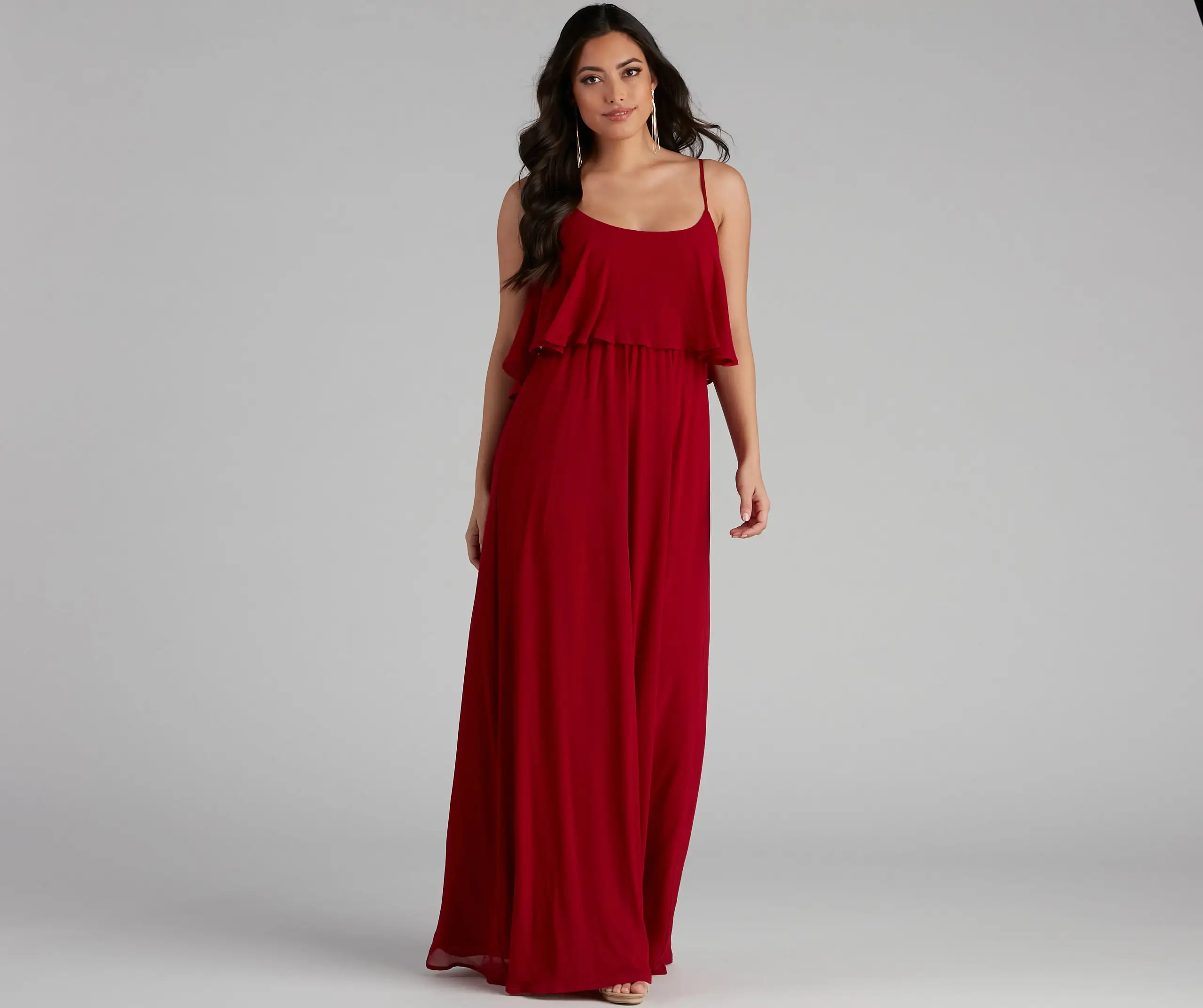 Leave them all entranced as you enter the room in the Mailyn chiffon formal dress that brings the ethereal vibes! She features a sleeveless scoop neckline, a ruffled trim overlay, adjustable spaghetti straps so you can customize the fit, an empire waist, and a flowy, floor-length silhouette. Dress her up in sparkly