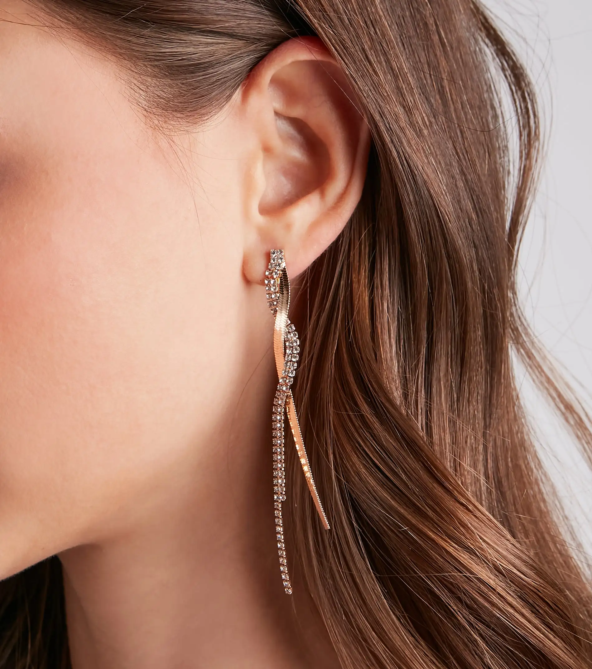 Level up your going-out looks with this pair of majorly luxe duster earrings. They feature a linear twisted design with a thin sleek snake chain and a thin two-row rhinestone adorned chain. Style these earrings with a