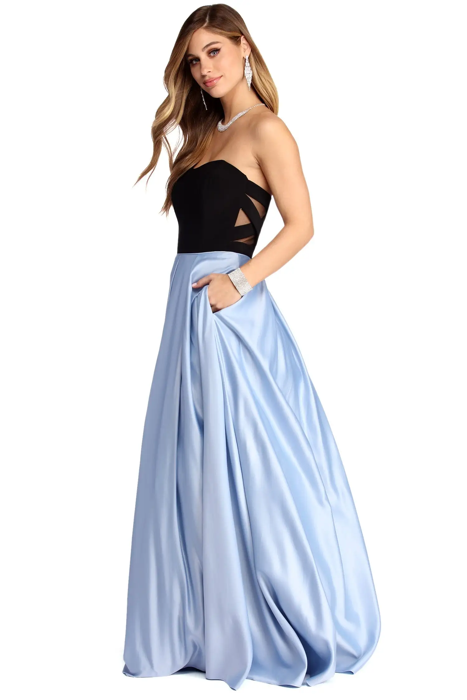 Make your night a regal affair as you radiate a look fit for a Queen in our timelessly gorgeous Marie dress! She features a black hued bodice with a strapless sweetheart neckline, a built in no slip strip, padded cups, built in boning and lattice strap accents on the side with mesh insets. Her slim fit bodice leads to a light blue hued satin ball gown silhouette accented with hidden side pockets, a petticoat and pleating details. Dress offers a relaxed fit with minimal stretch. Includes a back zipper closure.