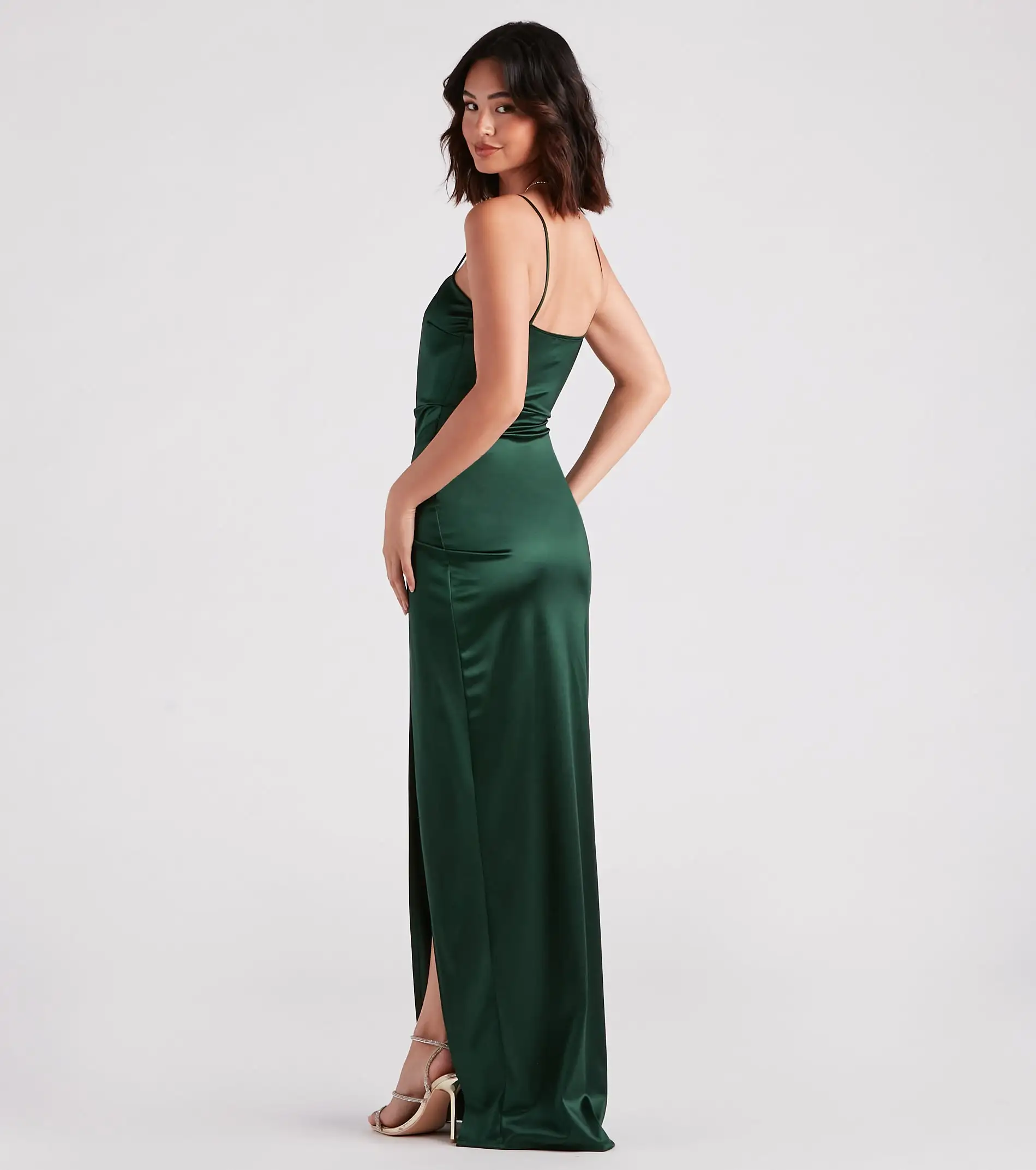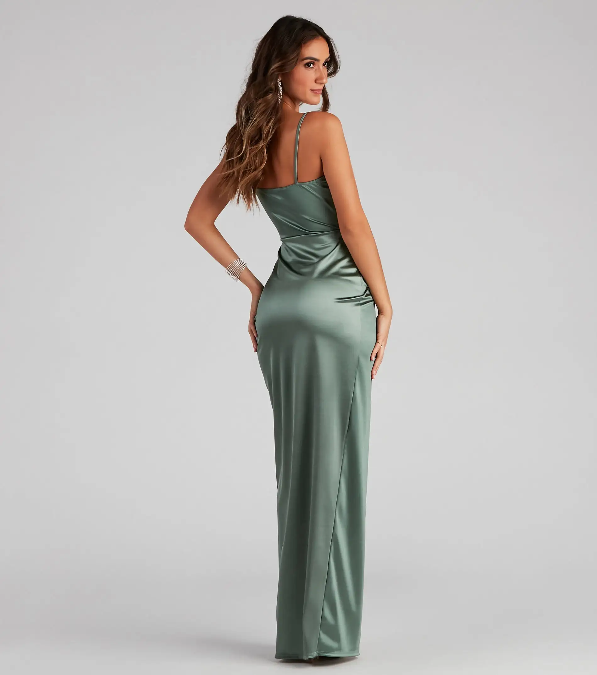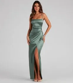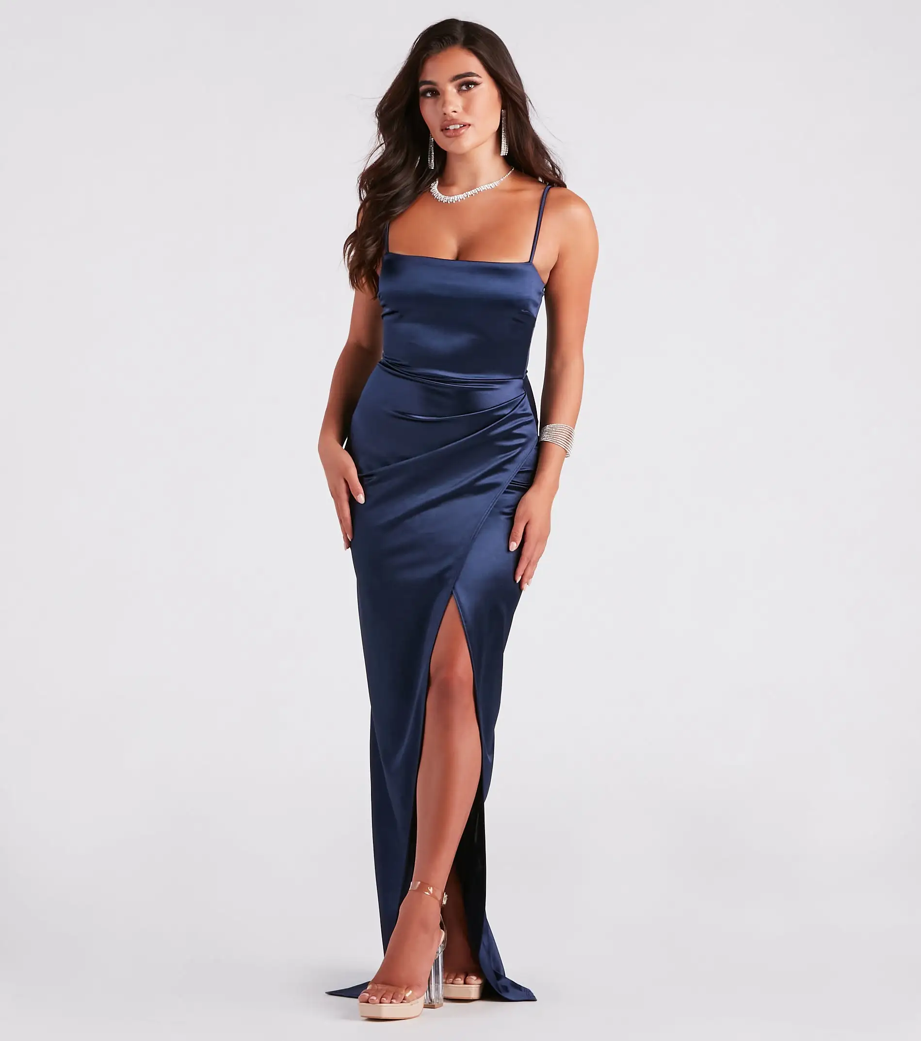 Slip into the luxe vibes of Mayra! She features sleeveless, spaghetti straps, and a square neckline atop a fitted bodice designed to flaunt your curves and show a peek of skin thanks to her high-cut front slit. The floor-length hem effortlessly elongates your figure on the buttery smooth satin fabric with plenty of stretch. Complete the look in sparkly