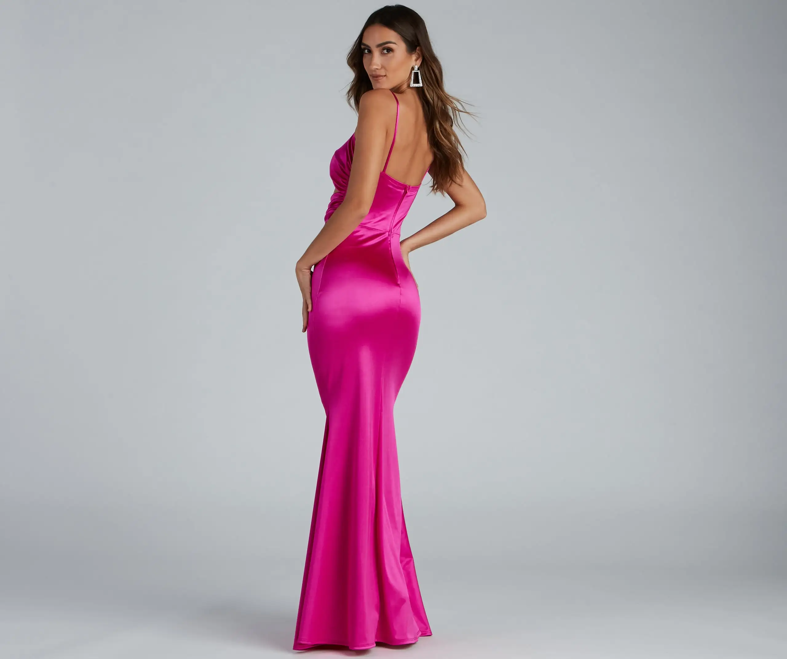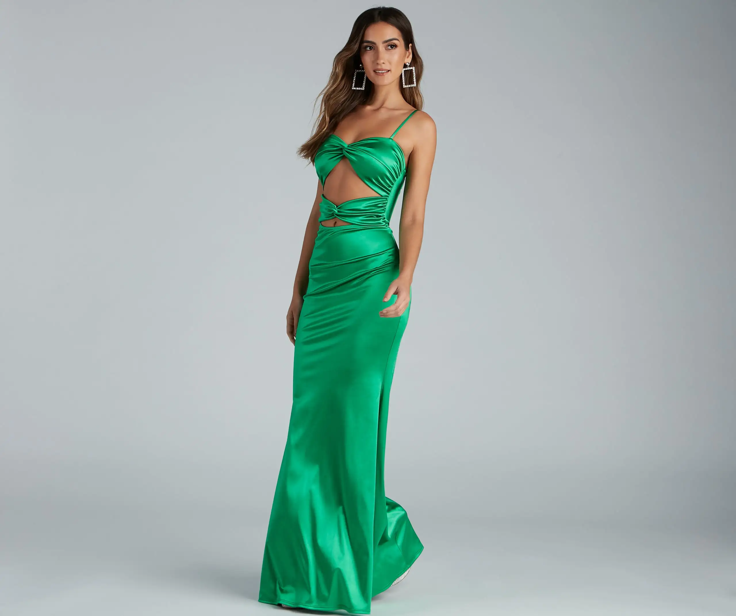 Showcase a sultry bold look in the stunning Melanie sleeveless mermaid dress. She features spaghetti straps, a double twist-front design with a sweetheart neckline and dual front cutouts, and a floor-sweeping fitted mermaid silhouette. Style this dress with neutral strappy