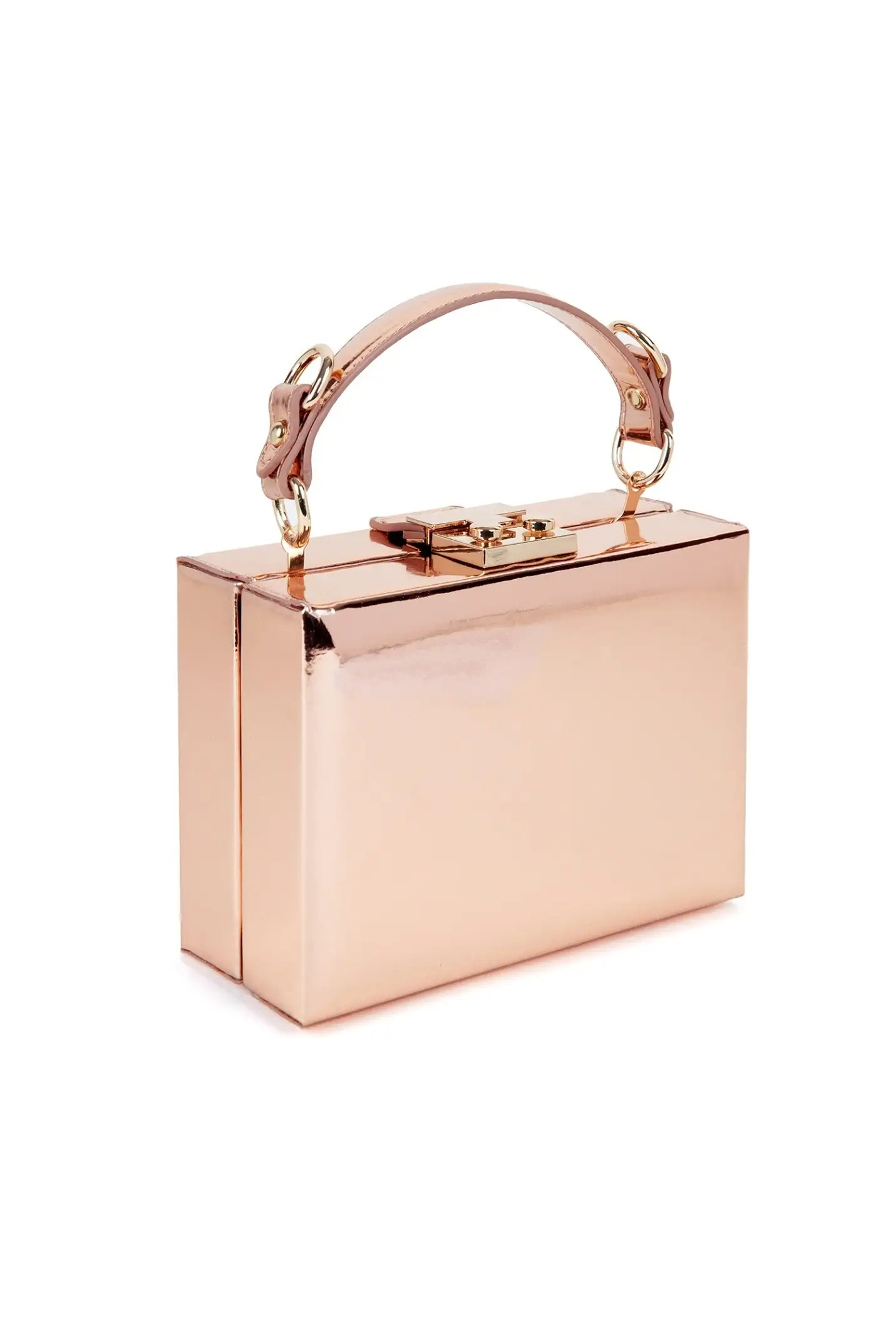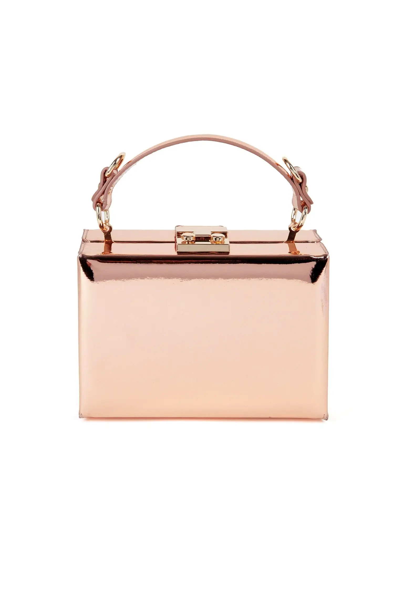 Bring dazzling shine to your look with this luxe handbag! It features a metallic rose gold color, a box design, a top clasp closure and a small handle. Interior is lined with a smooth knit material and includes a detachable strap.