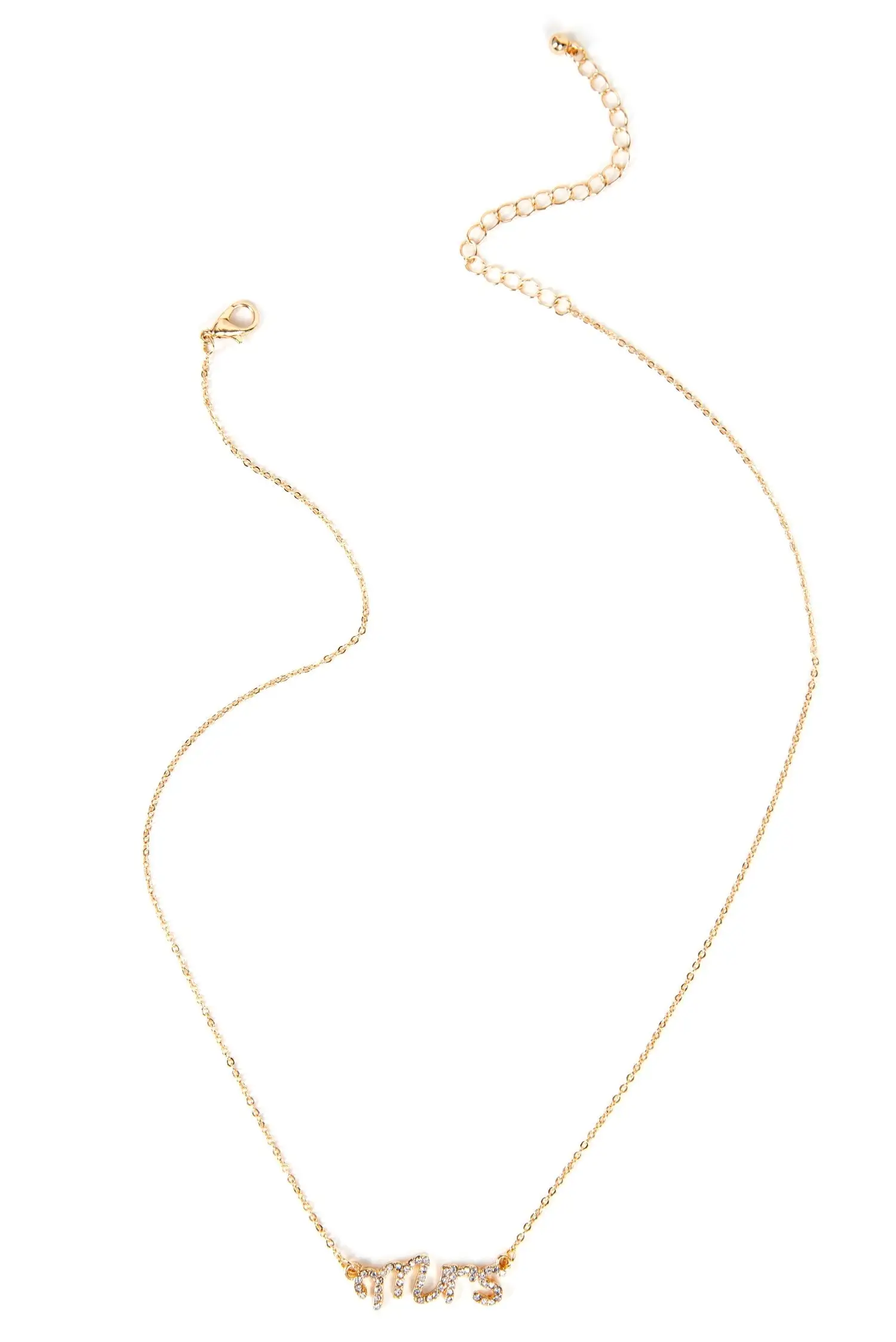 Show off your taken status with this necklace that says it all! It features a dainty gold chain and a rhinestone script that reads: “Mrs.” and a lobster clasp closure.