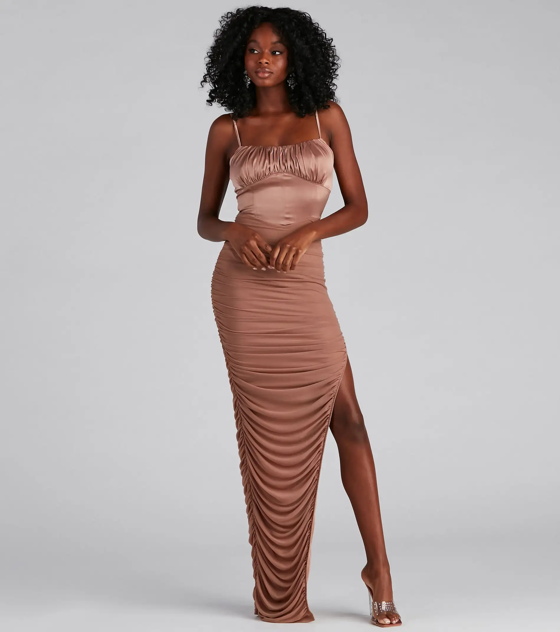 Slip into something fancy! The Myka formal square neck mesh dress is an elegant choice for prom and beyond. She features a sleeveless, satin-ruched bodice with adjustable spaghetti straps for a custom fit. Her empire waist shapes a form-fitting silhouette ruching throughout with a side slit perfect for showing off your