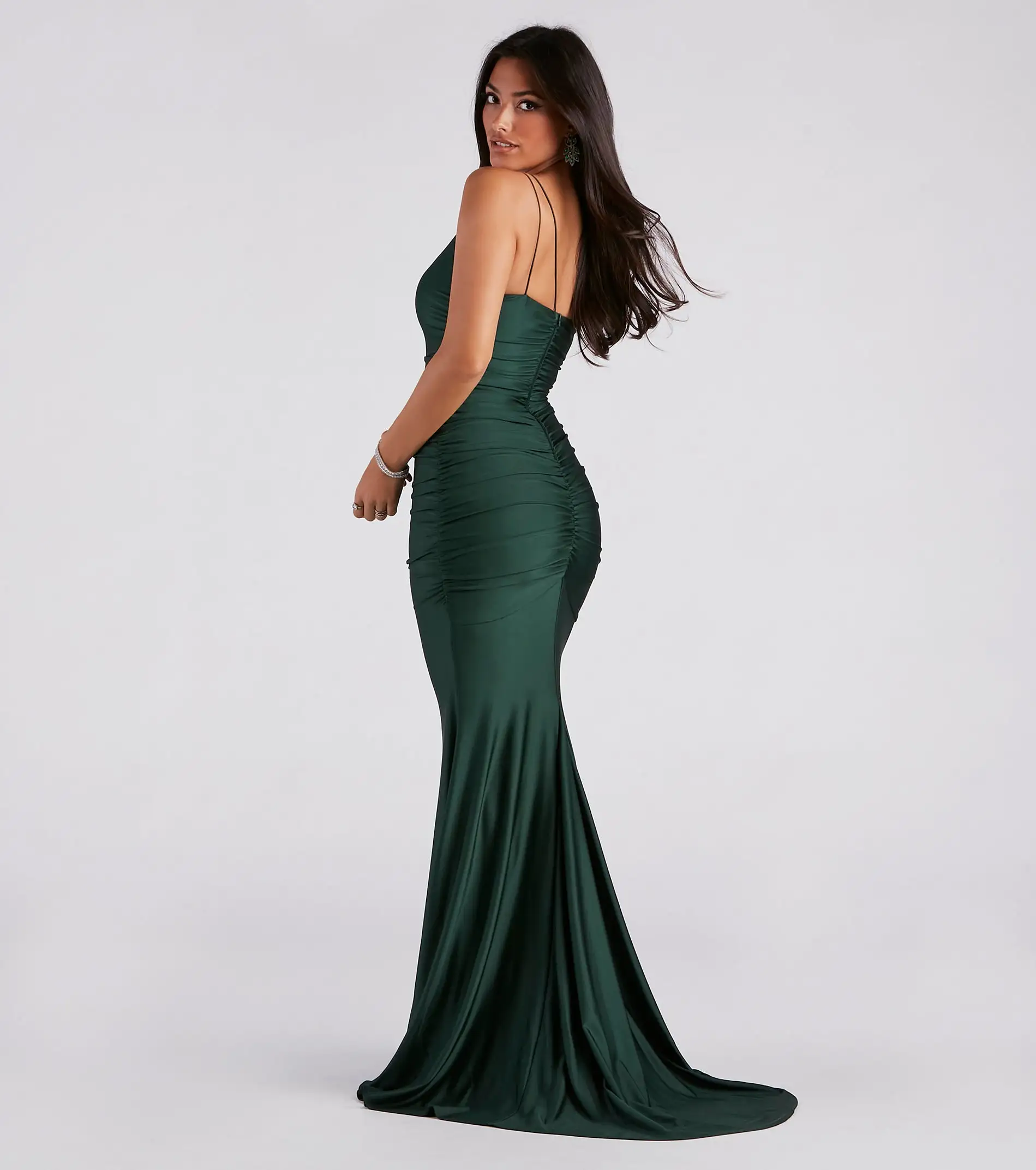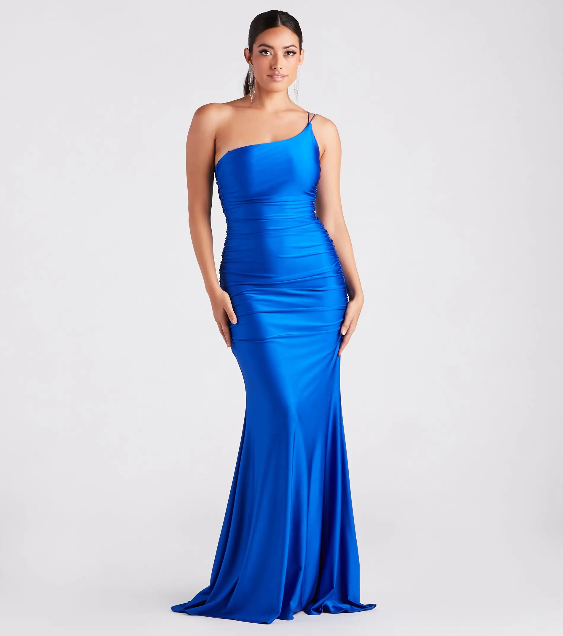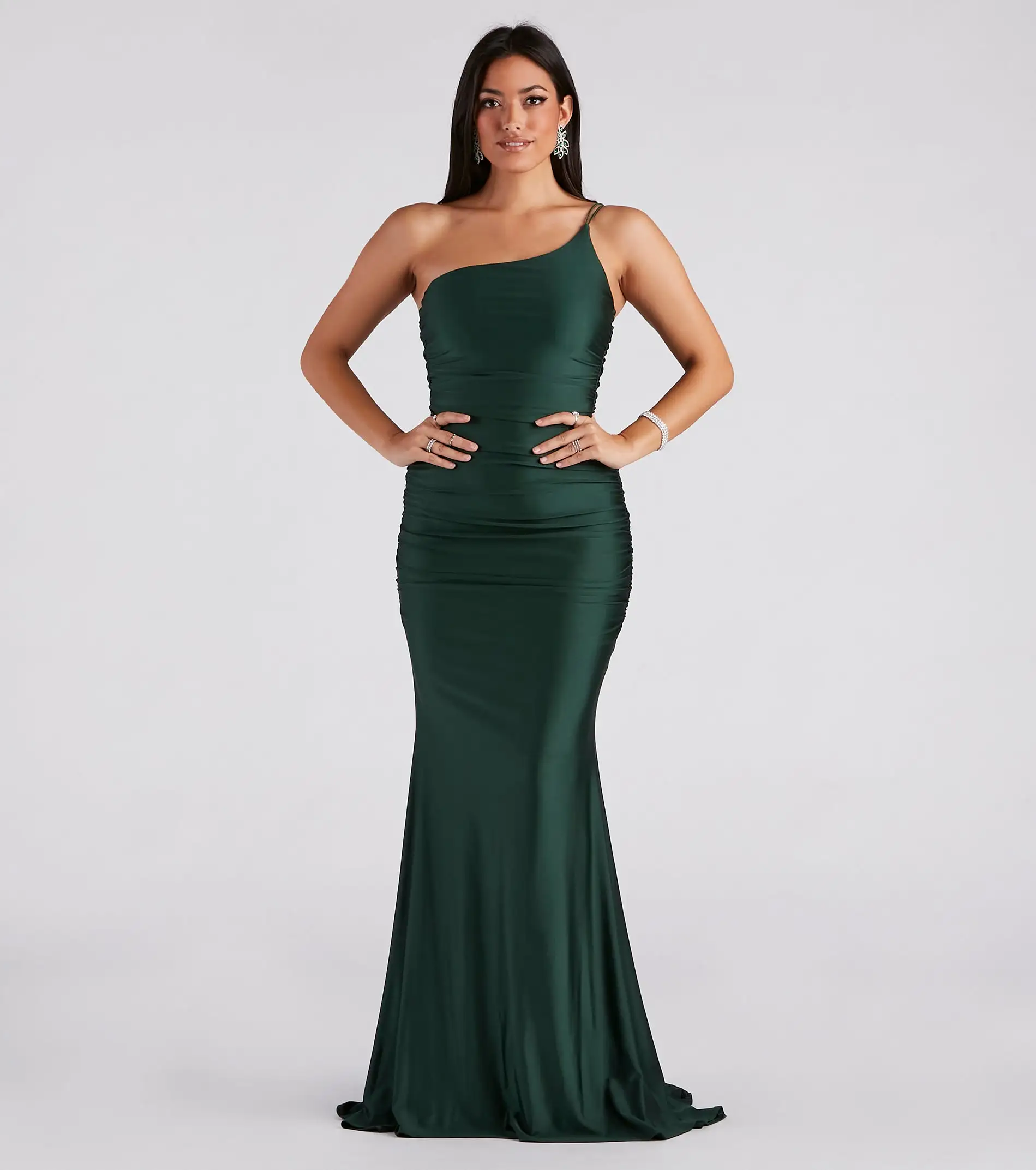 Flaunt your figure in the sophisticated and sultry Nicole formal dress as a stunning bridesmaid, wedding guest, or black tie event! She features a sleeveless one-shoulder neckline, padded bust, dual bungee spaghetti straps, and side and back ruched seams to accentuate your curves along her flattering mermaid silhouette with a floor-length hem. The dress is composed of a sleek knit fabric with a sewn-in lining and plenty of stretch. Complete the look with a dainty