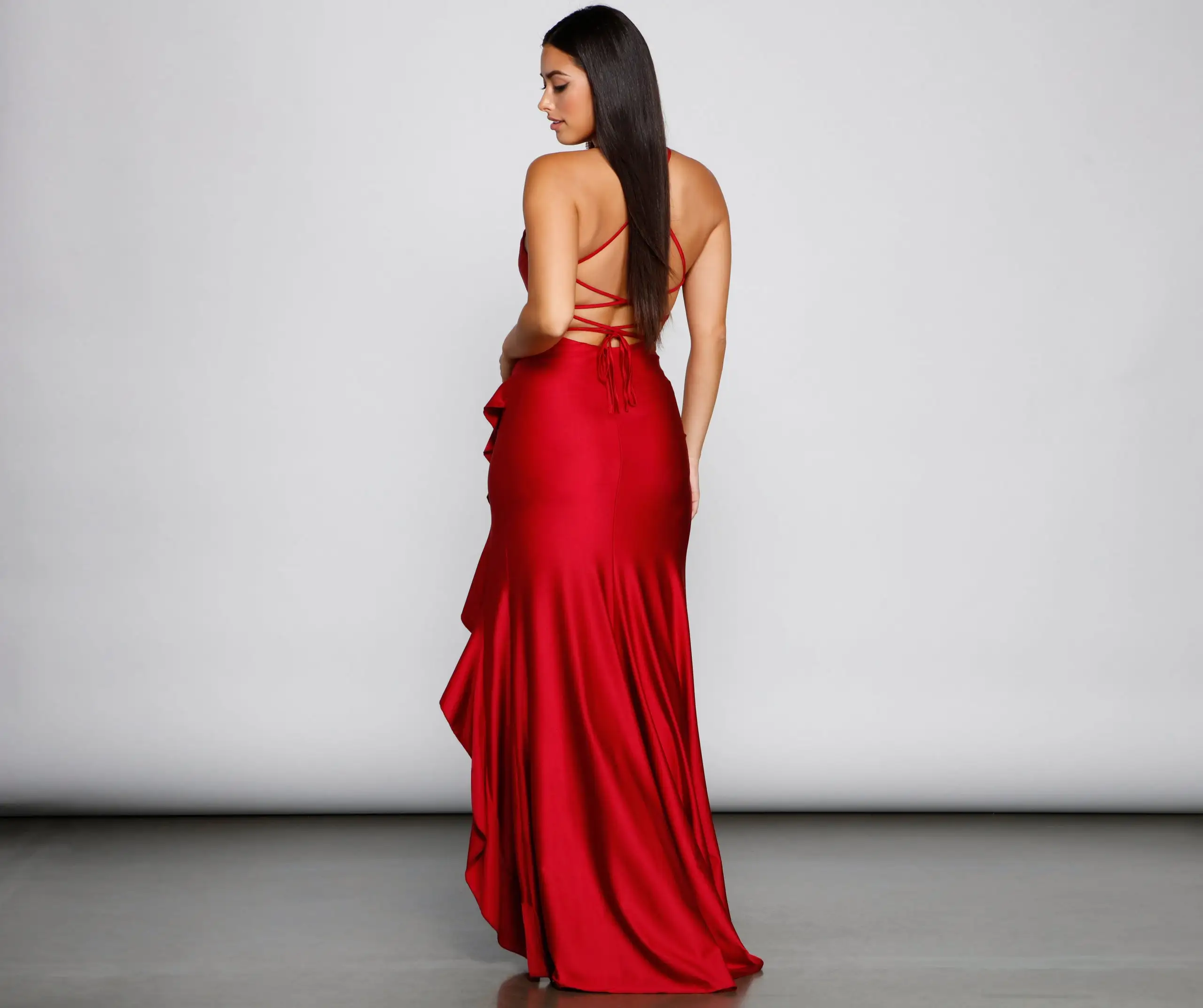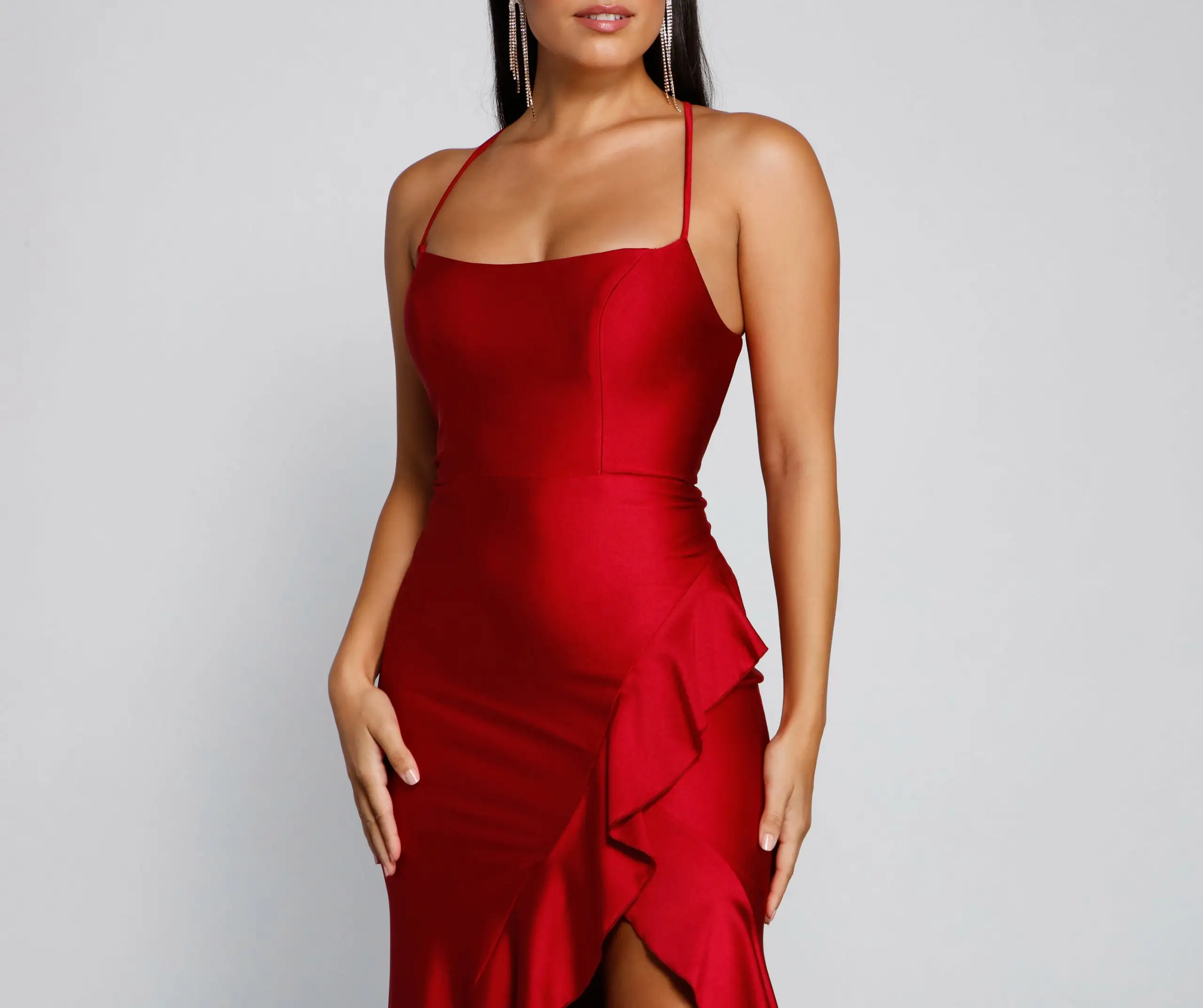 Bring the dramatic flair in the stunningly bold Paige formal dress. She features a sleeveless square neckline, spaghetti straps that lead to a cross-back lace-up design, a floor-length wrap-front skirt creating a front slit, and chic ruffle detailing. Style this dress with