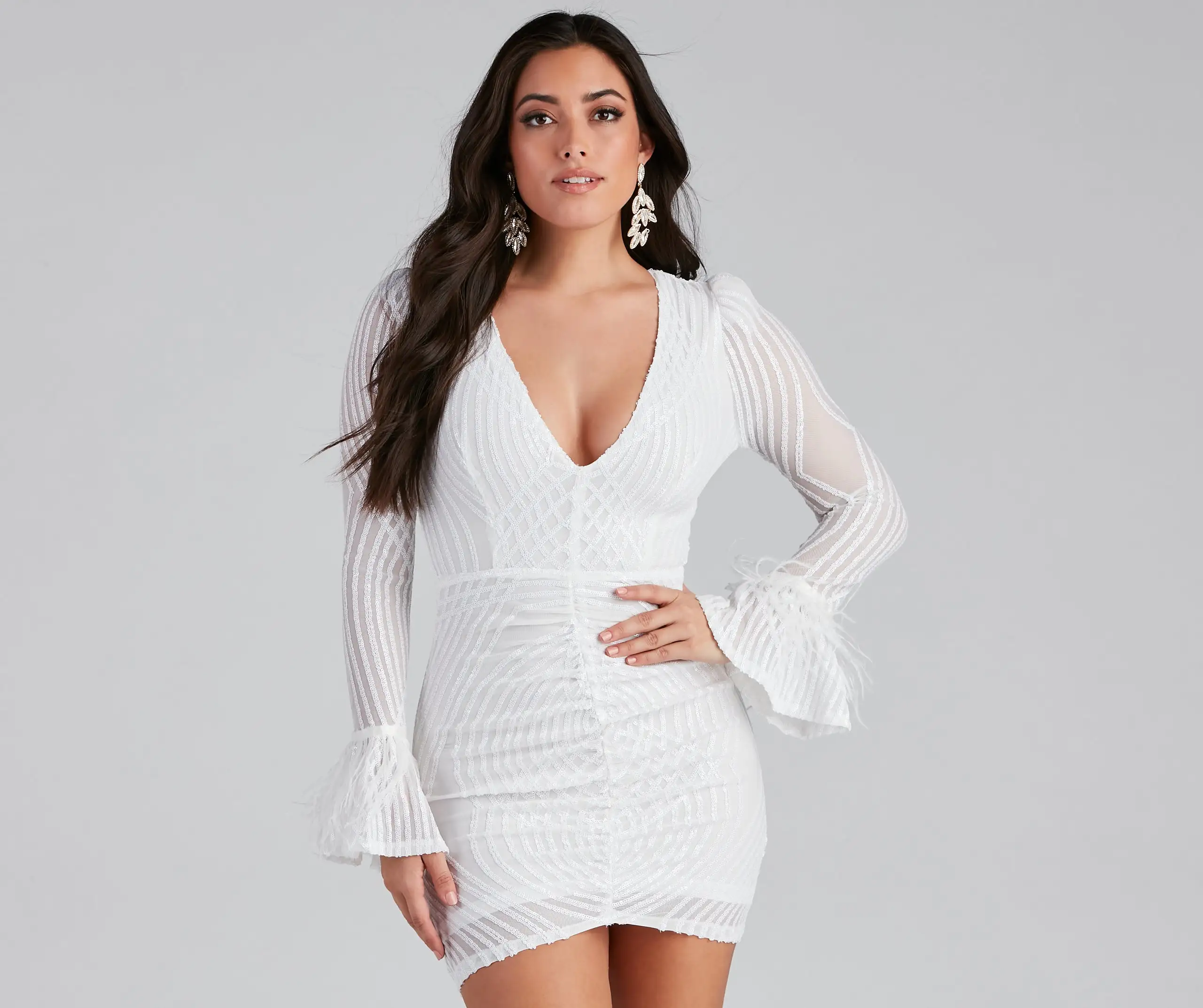 Dazzle in a bold formal bodycon dress that stands out from the rest! Paola features a plunging V-neckline, long sleeves with a feather trim at the cuff, a ruched center with a drawstring, a dazzling geometric sequin pattern, and a mini-length silhouette. The dress is composed of a lined mesh fabric that offers a form-hugging fit with slight stretch. Complete the look with