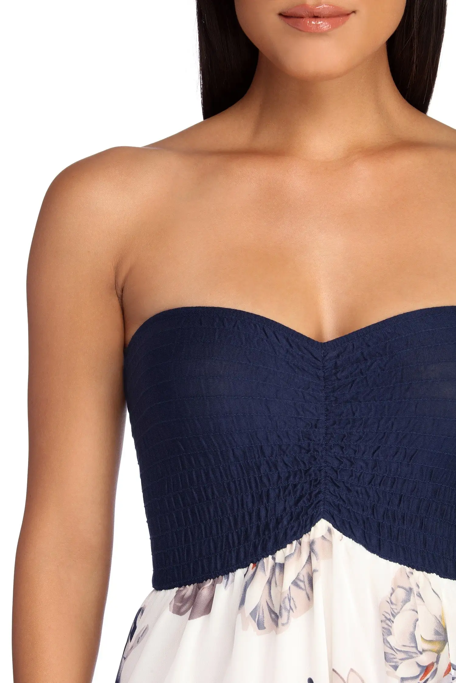 Show your passion for pretty florals in this captivating maxi dress! It features a navy blue hued smocked bodice with a sweetheart neckline and leads to a sweeping maxi length silhouette. The skirt features a head turning floral print with coral and blue hues that contrast with the ivory hued background. Dress is composed of a combination smock and chiffon knit fabric that offers a relaxed fit.