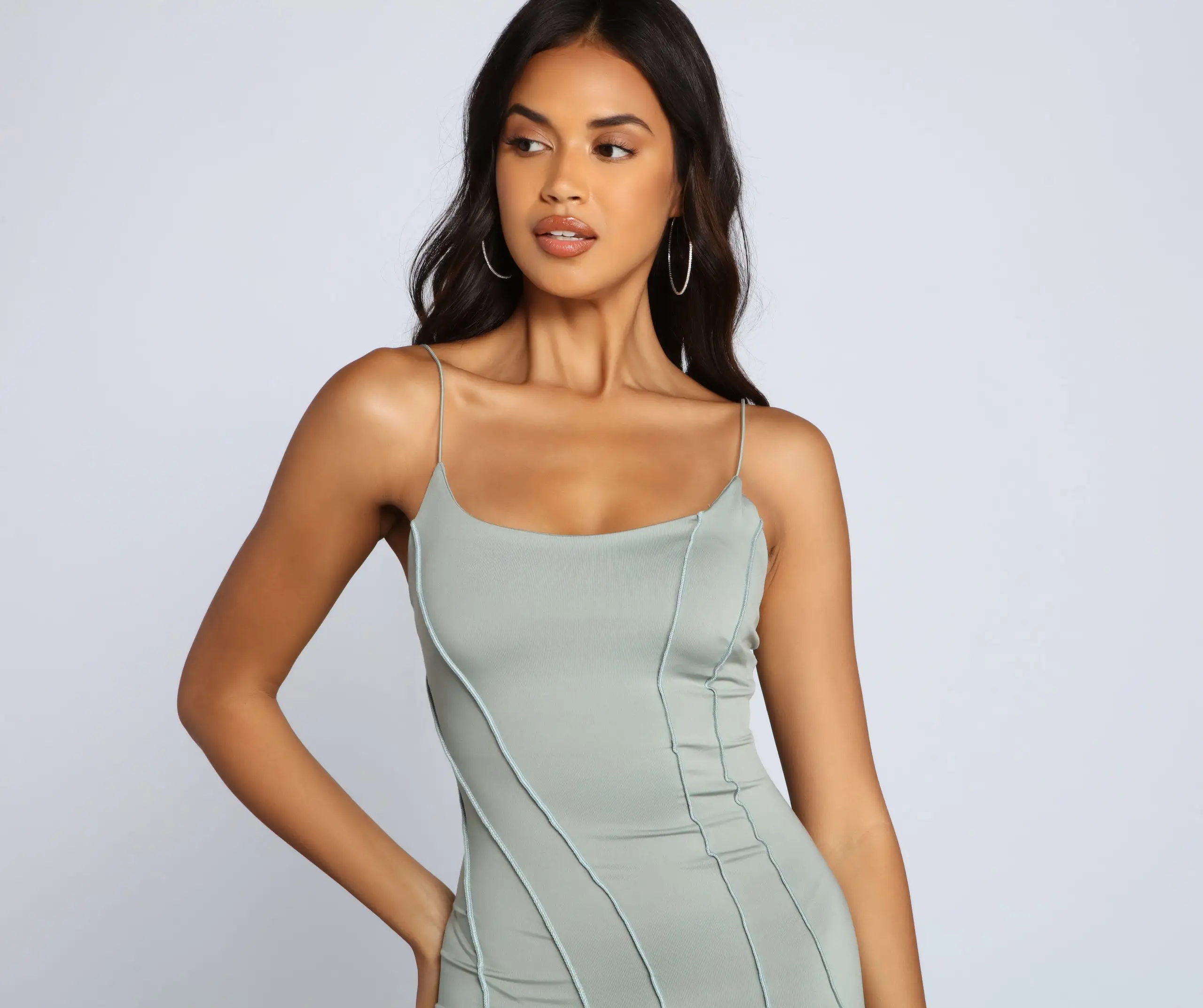Create a picture-perfect moment in a cute mini dress! The dress features a scoop neckline, spaghetti straps, an exposed seam pattern, and a mini-length silhouette. The dress is composed of a smooth knit fabric that offers a form hugging fit with a moderate stretch. Complete look with heels and
