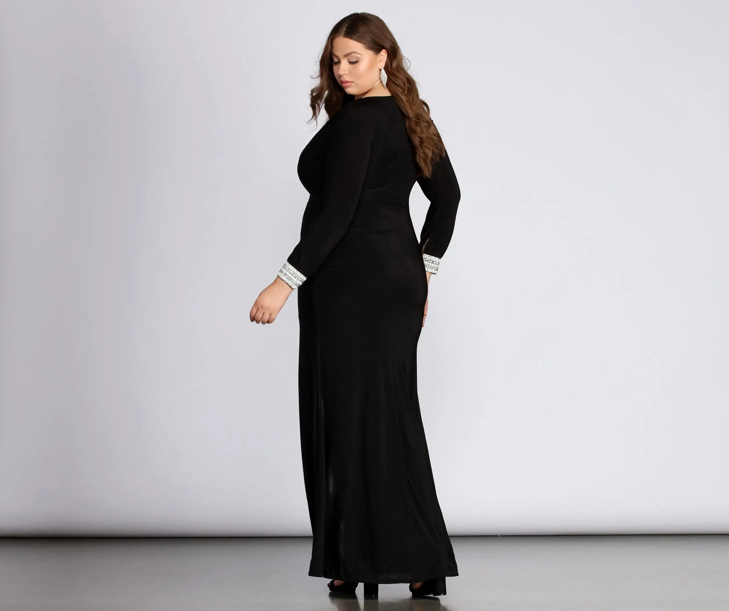 You’re a true one of a kind, make that known in our breathtaking Athena dress! She features a chic black hue, a plunging V neckline, long sleeves with pearl embellished cuffs, ruching along the seam, a daring high slit and an asymmetrical silhouette. Dress is composed of a smooth knit fabric that offers a curve flattering fit that offers plenty of stretch. Includes a mini skit length knit lining.