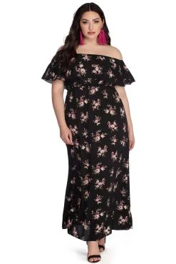 This beautiful floral maxi dress is perfect for your spring and summer occasions! It features a stretchy off the shoulder neckline with a ruffle pop over, a stretchy high waist seam, and a flowy floor-length skirt. Dress is composed of an unlined crepe fabric with no stretch.