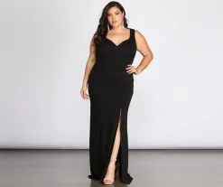 Make them all take a second look in our gorgeous Kaitlyn black dress! She features a sleeveless bodice, a plunging V neckline, supportive shoulder straps and a flattering ruched empire waist. Her relaxed fit bodice leads to a curve hugging floor length silhouette accented with vertical seams to create an hourglass illusion and a high side slit. She is composed of a lined crepe fabric that offers plenty of stretch. Includes a back zipper closure with ruched detailing and a mini skirt length knit lining.
