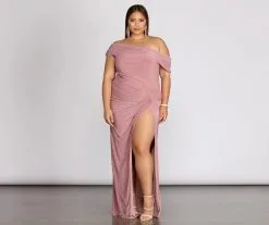 Keep a classy profile in our floor length Kaleigh dress! She features an off the shoulder neckline with ruched detailing on one shoulder and ruched detailing along the sides to create a gracefully cascading effecting leading to a sexy high slit. She is double lined with a soft to the touch knit fabric that offers a curve hugging fit that provides plenty of stretch.