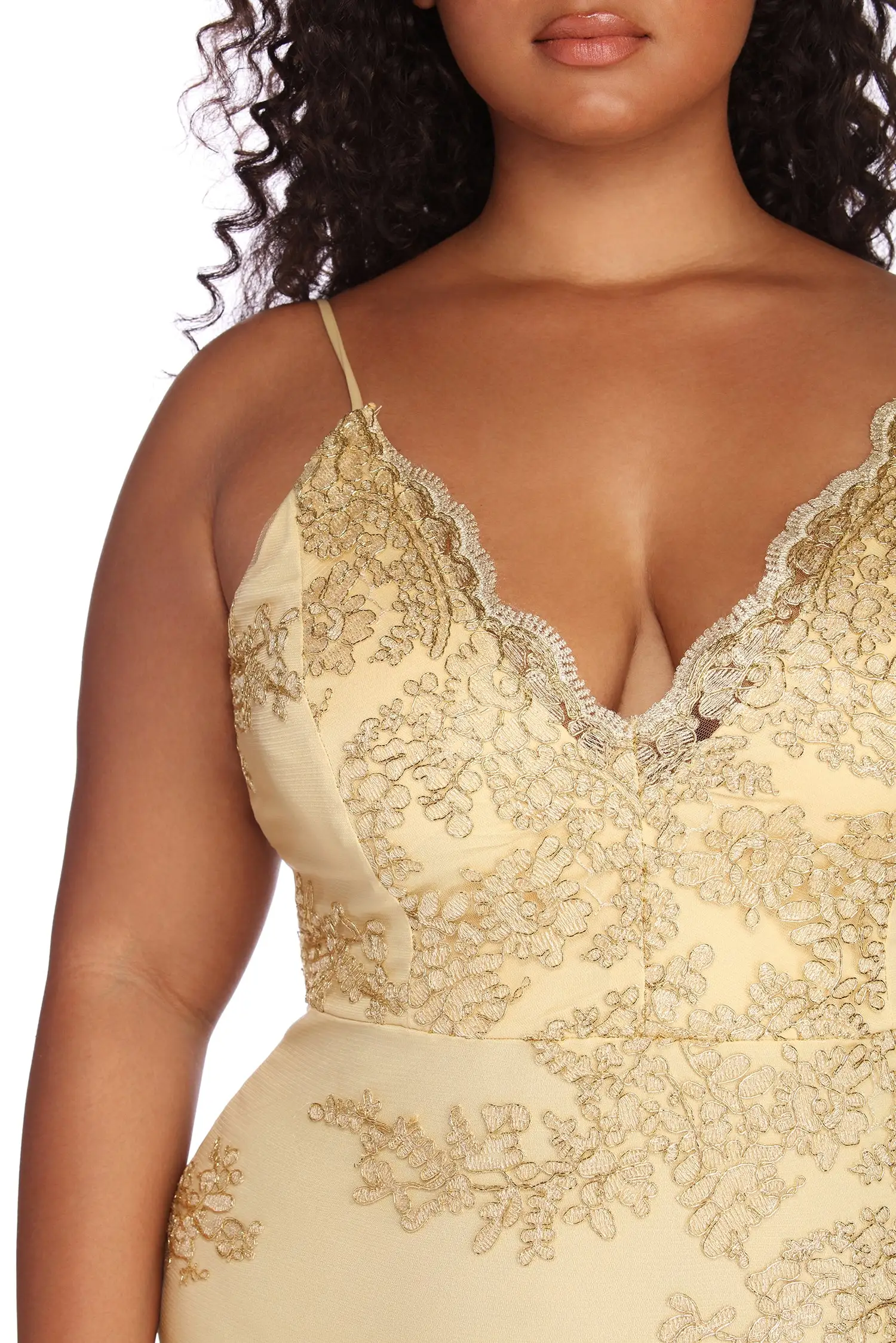 Make a darling appearance in lace! This mini dress features a sleeveless bodice, a plunging V neckline with a scalloped lace trim, supportive padded cups, adjustable narrow straps and princess seams. The relaxed fit bodice leads to a curve flattering mini length silhouette accented with a side slit. Dress is composed of a lined mesh fabric adorned with a scalloped lace design with a metallic outline. Dress offers a moderate stretch and includes a back zipper closure.