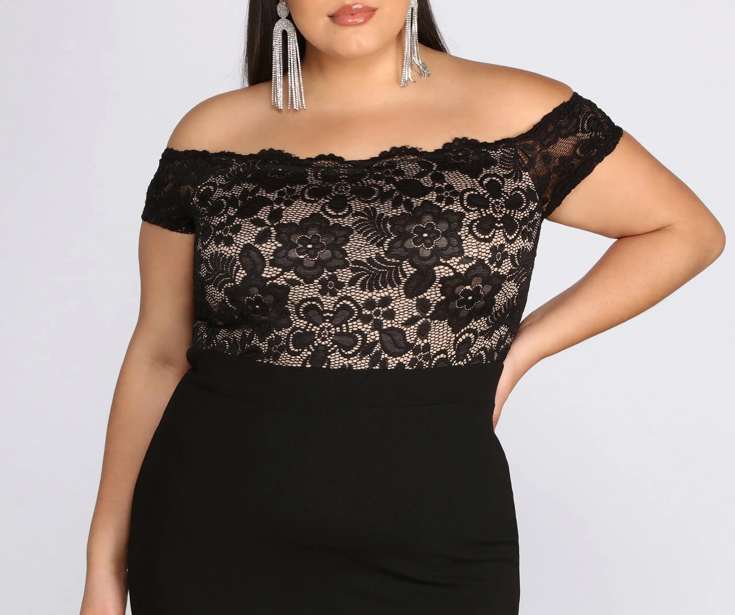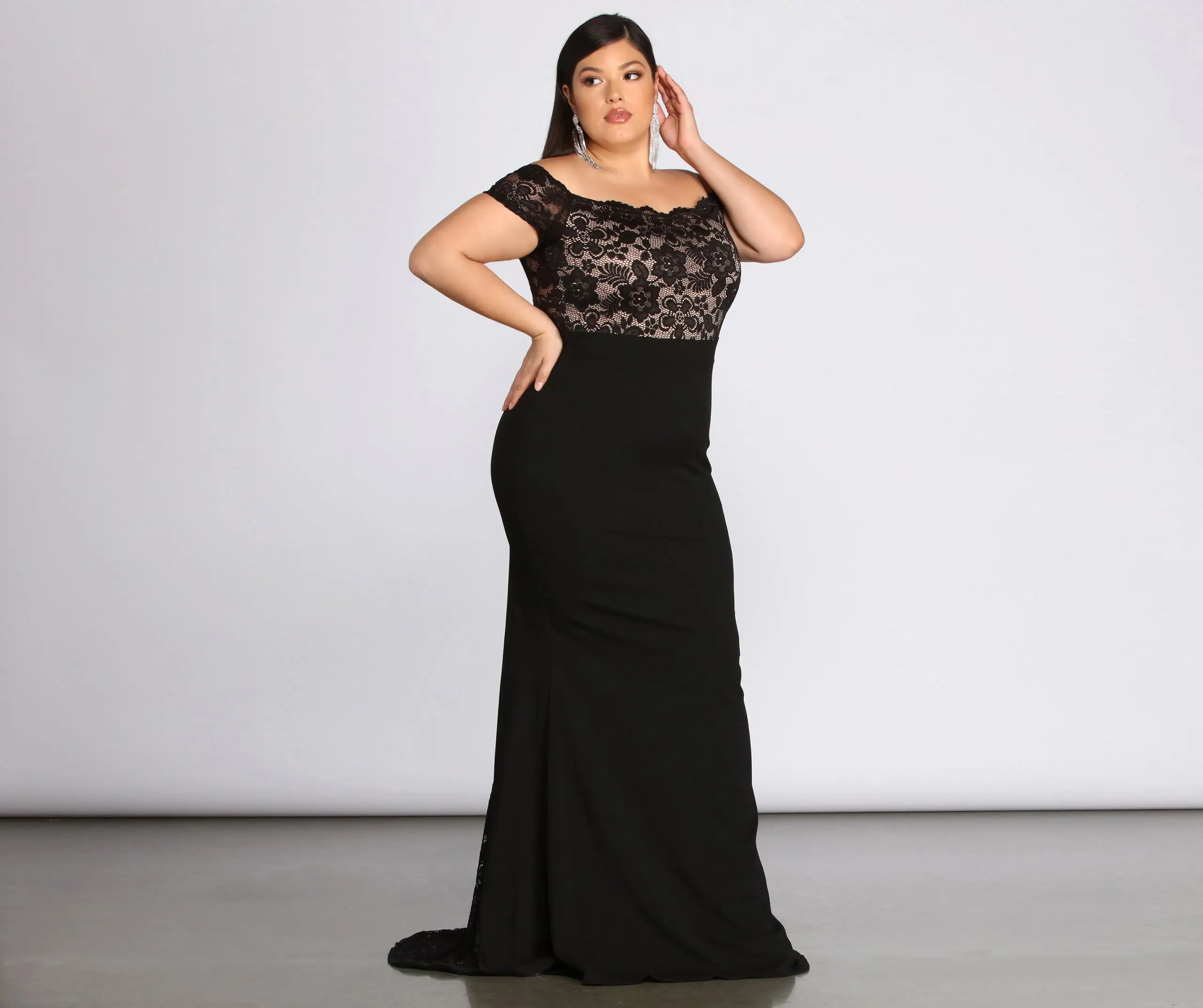 Bring elegance and grace in our head turning Layla dress! She features an off the shoulder neckline, unlined short sleeves and a lined scalloped lace bodice. Her relaxed fit waist leads to an elongating curve flattering floor length silhouette that creates a wowing hourglass illusion. Her silhouette is accented with an unlined scalloped lace train to make a dramatic exit! Dress is composed of a combination lace and crepe fabric that offers a moderate stretch.