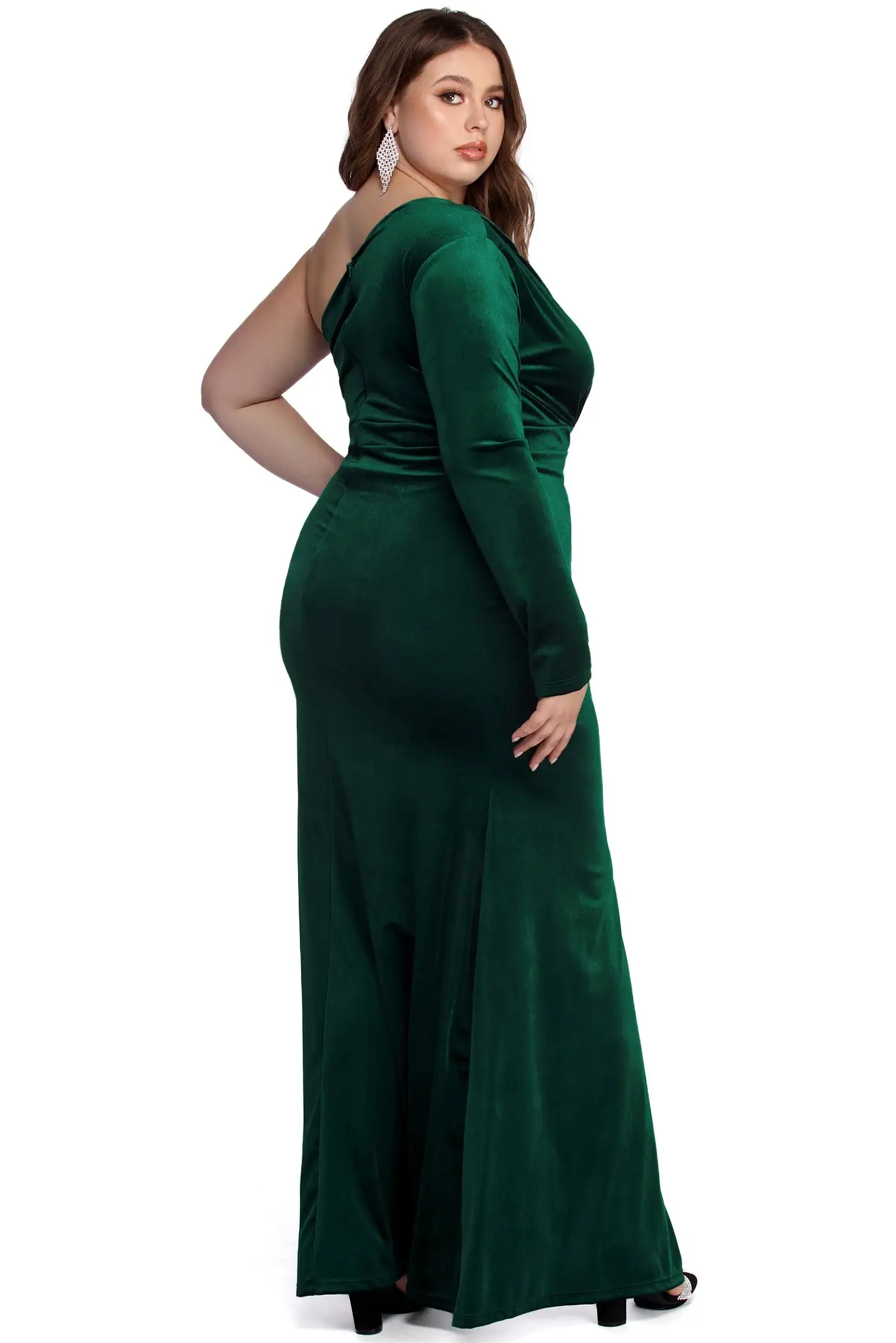 Create a head turning moment in our glamorous Marina dress! She features a one shoulder neckline, a long sleeve with ruched detailing at the shoulder and a daring asymmetrical keyhole at the bust. Her relaxed fit bodice leads to a sweeping floor length silhouette that is accented with a high side slit. Dress is composed of a lined velvet fabric that offers a curve flattering fit with a moderate stretch. Includes a back zipper closure.