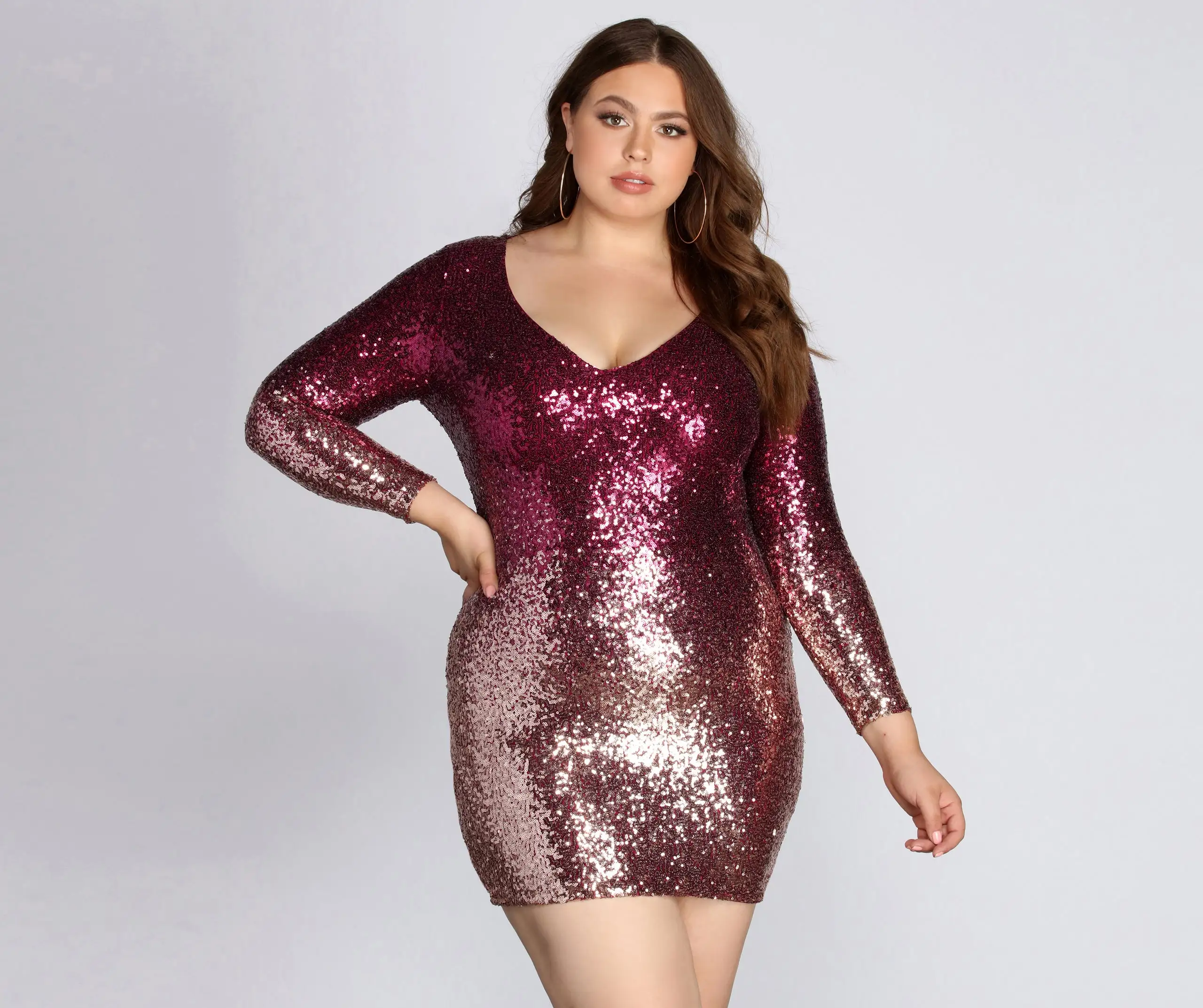 Who needs those flashing lights when you’re already lit in this sequin party dress? This fun piece has a deep V neckline, long fitted sleeves and a curve hugging fit. Dress is composed of a sequin fabric that offers a slight stretch and a gorgeous, attention-grabbing ombre design.