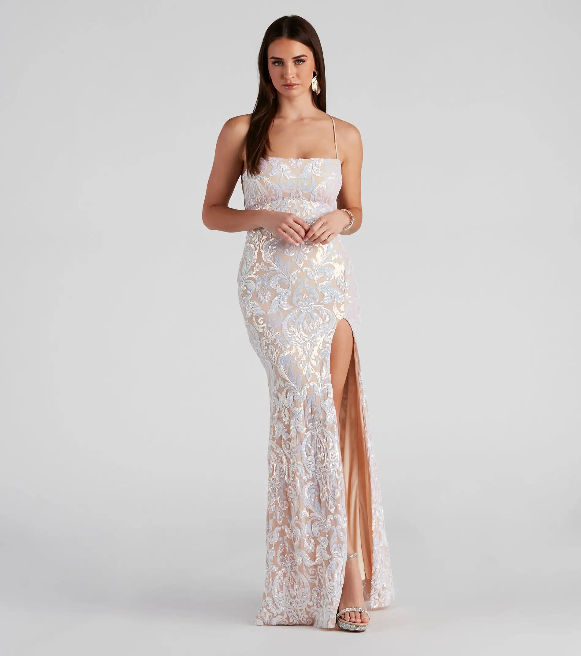 Bring the sparkle in the dazzling Priya formal dress! She features a captivating iridescent sequin scroll print, a sleeveless square neckline, sleek spaghetti straps, a sexy lace-up back, and a floor-length silhouette accented with a high side slit. The dress is composed of a lined mesh fabric that offers a form-hugging fit with minimal stretch. Complete look with clear heels and a