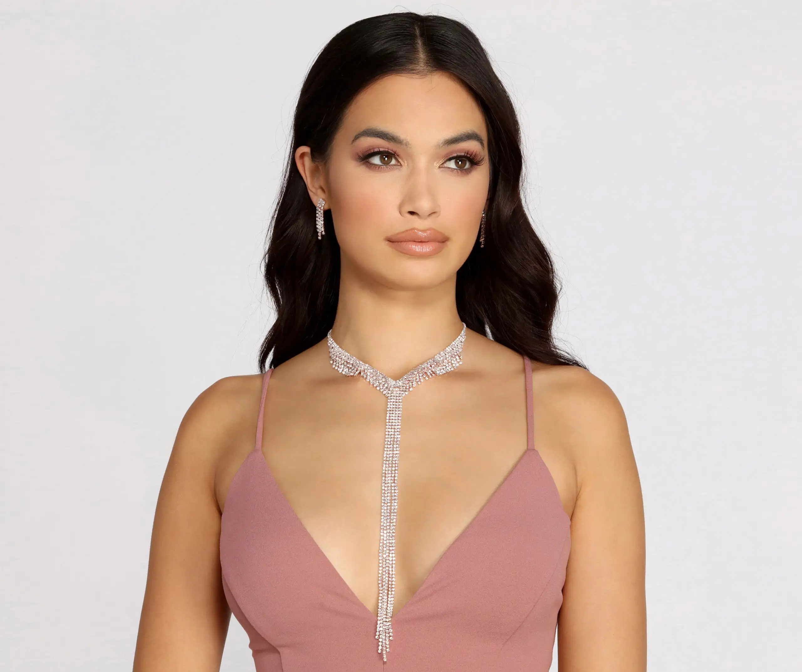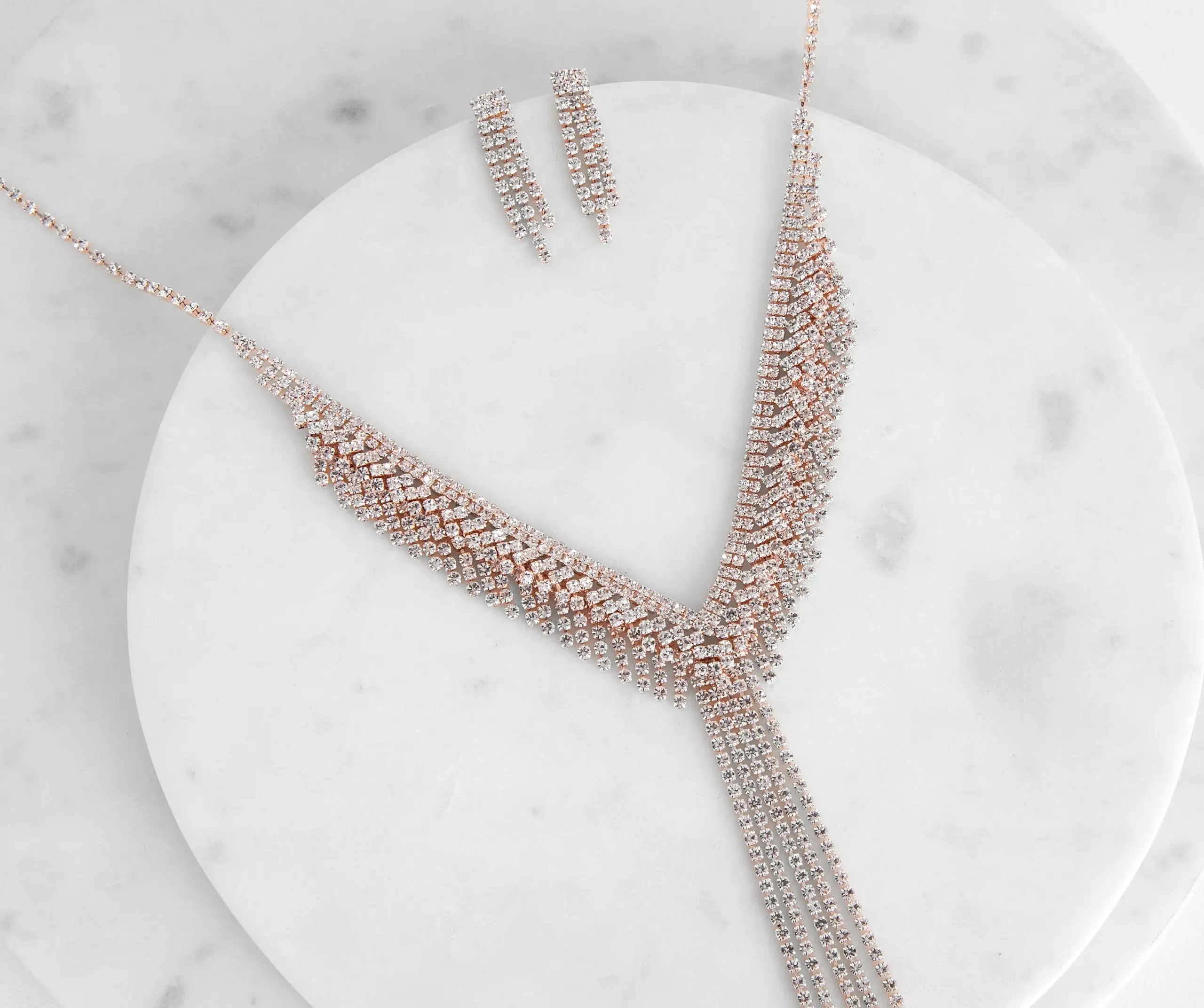 Show your radiance when you highlight your beauty with a stunning rhinestone fringe lariat necklace + earring set bb!