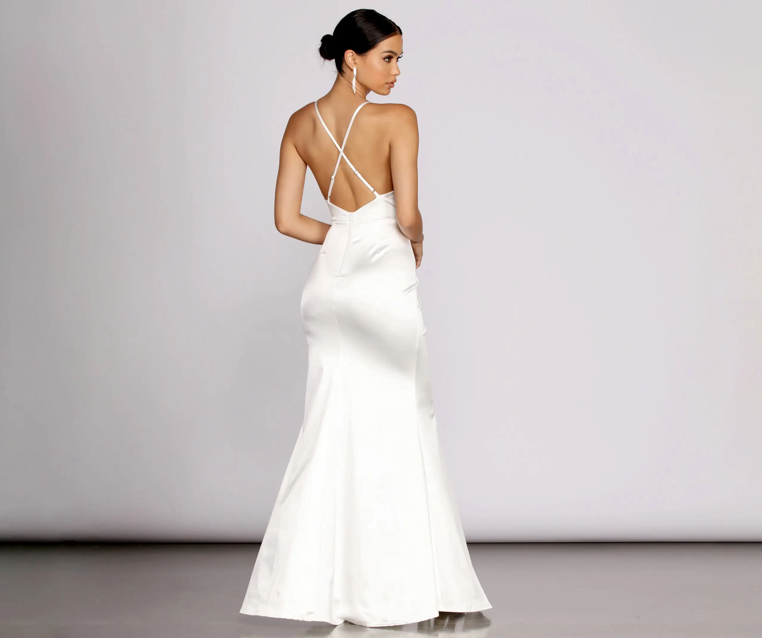 Set off sparks in the Raelynn dress that brings the sultriness for your next evening out. The Raelynn formal satin dress features a plunging V-neckline that styles well with your favorite statement necklaces and a bold open back with adjustable cross straps. The fitted bodice leads to a curve-hugging mermaid silhouette that is accented with a sexy front, thigh-high slit. Complete your look with
