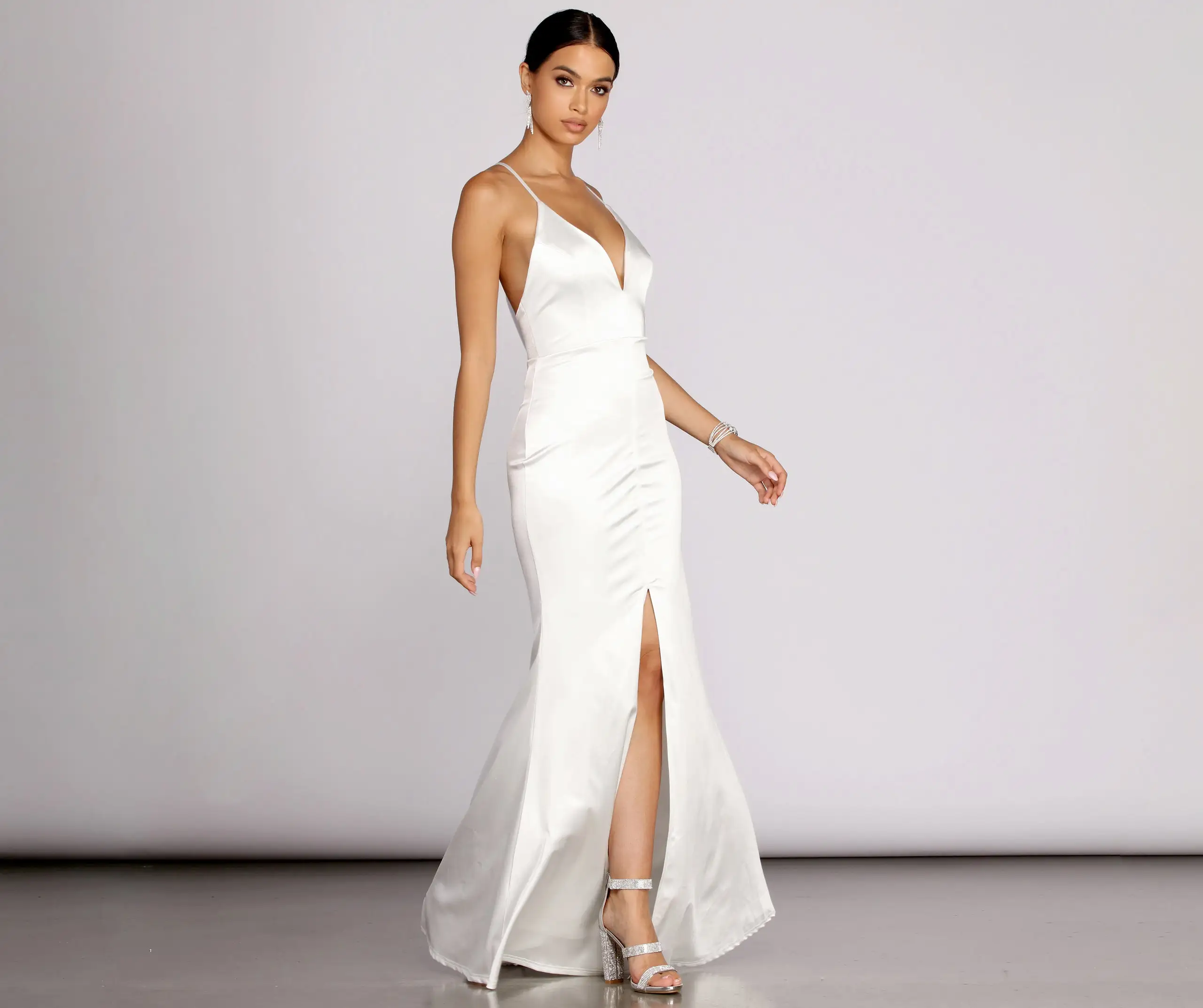 - Floor-length Mermaid silhouette, front thigh-high slit