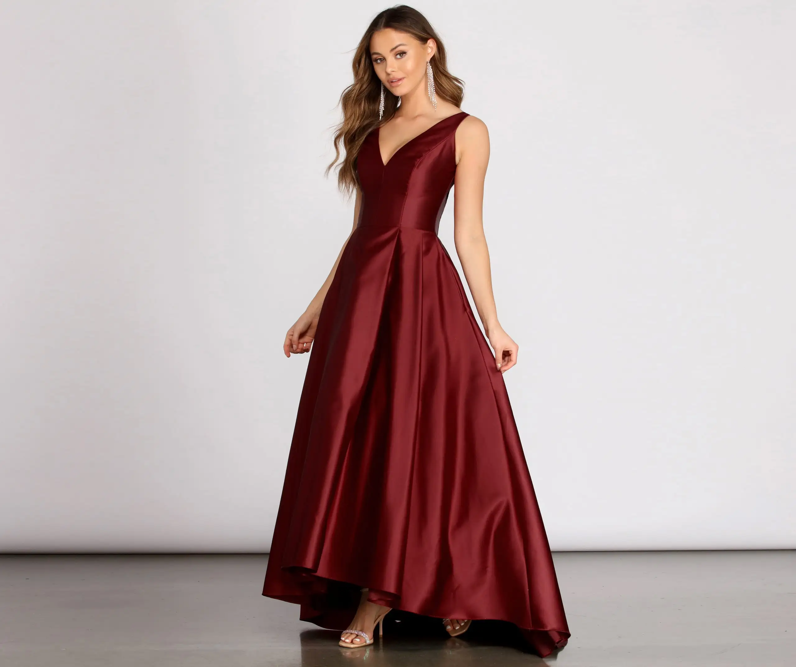 Simply elegant, that is what Reina brings to your special evening! She wows with a plunging V neckline, supportive tank-like straps and princess seams. Her slim fit bodice leads to voluminous ball gown silhouette complemented with hidden side pockets, pleats and a petticoat. Dress is composed of a textured satin fabric that offers a minimal stretch.