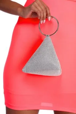 Complete your look and look so fine in rhine with this rhinestone adorned wristlet! The silver bag features a pyramid shape with a large O-ring wristlet and a side zipper closure. Bag is composed of a lined chain metal fabric embellished with mini rhinestones.