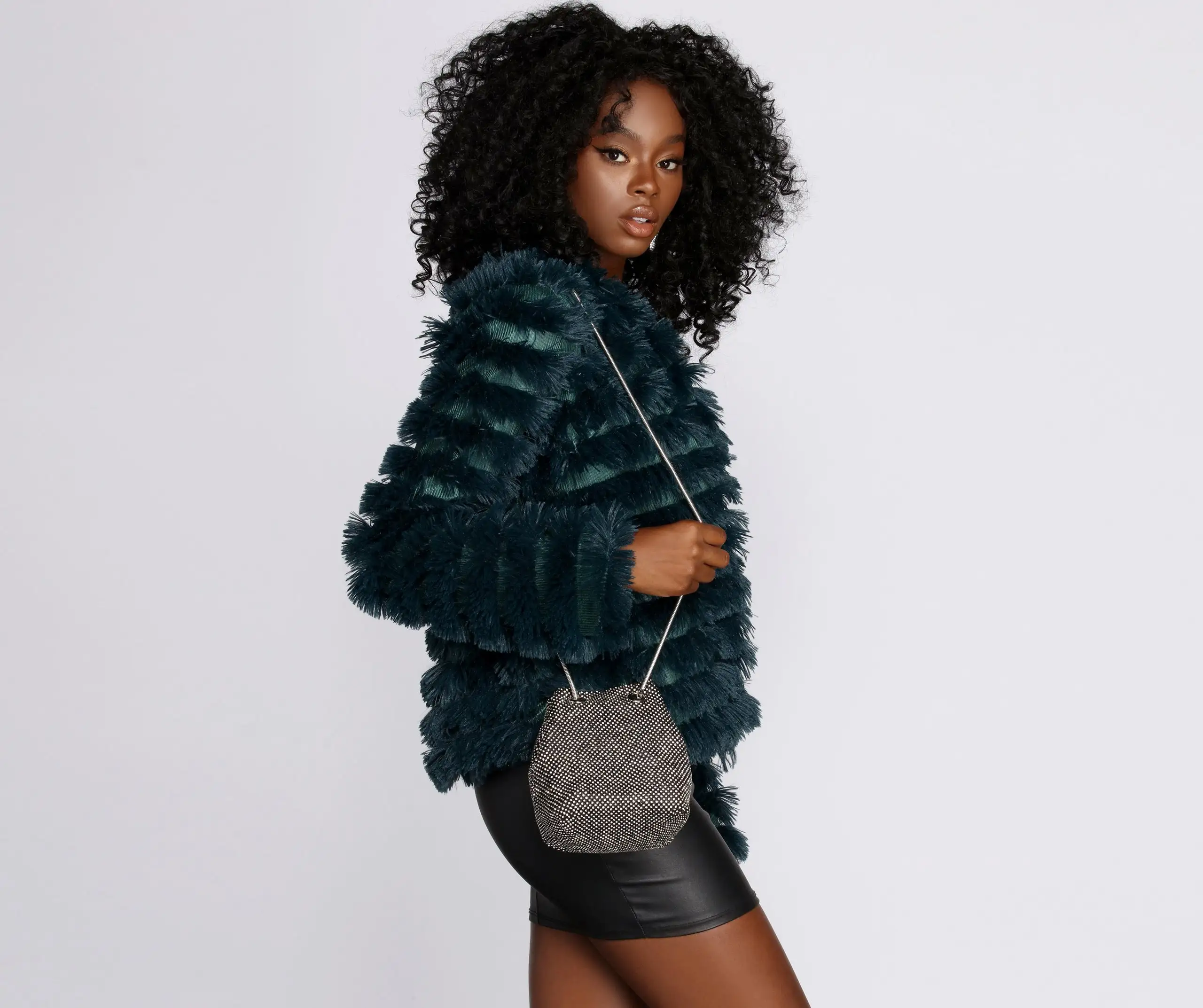 Blind the haters with your blingy bag. This purse features double chain carrying straps, grommet accents, and an embellished, net exterior with ribbon-like textile lining. It’s topped with an open top and is the perfect size to fit all your going-out essentials.