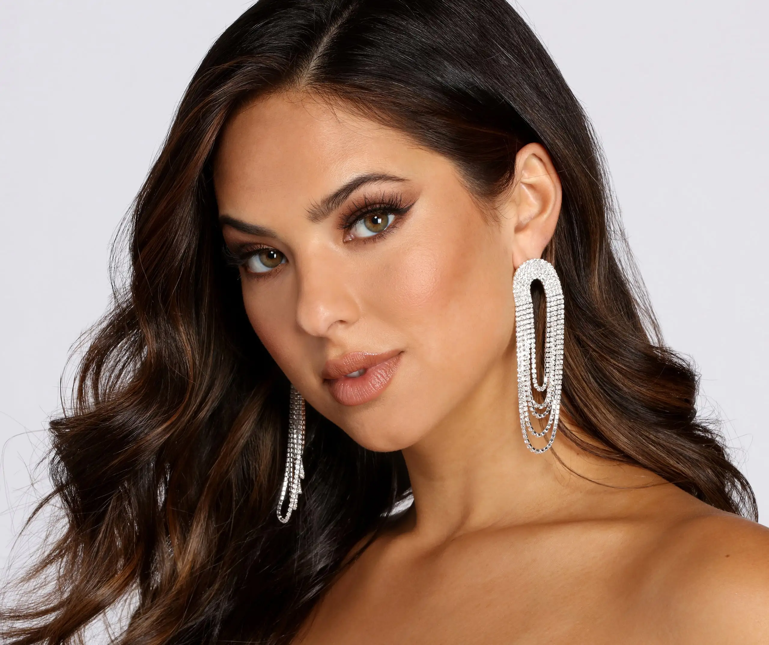 Show a little swag woman! This pair of statement earrings are designed with an over-sized oval shape. The top half is firm and has rows of rhinestones and leads to a loose lower half that gives off a fringe vibe while being fully connected. Earrings have post back closures.