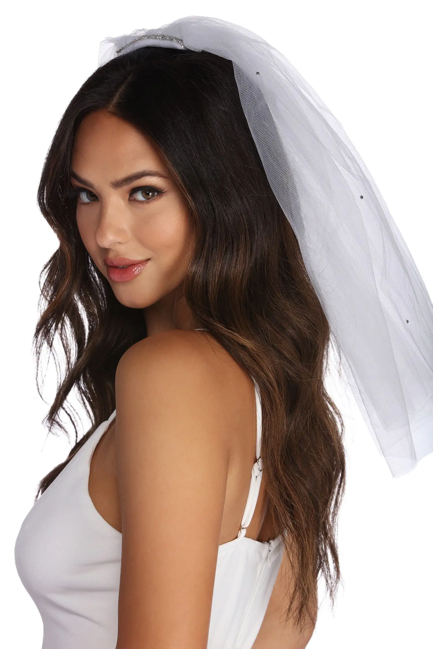 Complete all your romantic looks with the perfect accessory! This white veil features a french comb clip to lock your pretty hair in place, adorned with a rhinestone trim and attached to flowing tulle with rhinestone details.