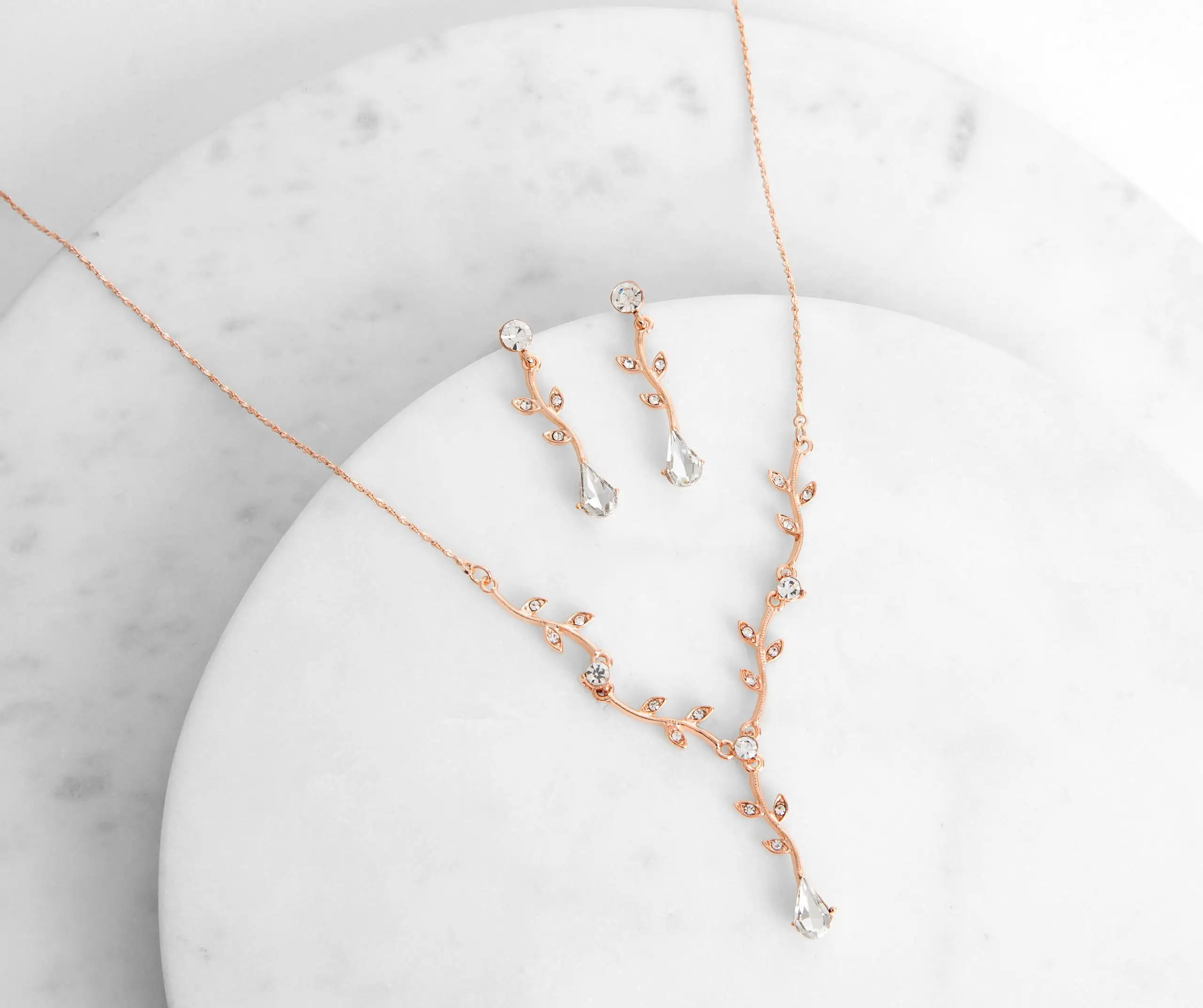 Give yourself a romantic finish with a charming leafy rhinestone necklace set! Bound to bring the perfect amount of elegance to your look doll!