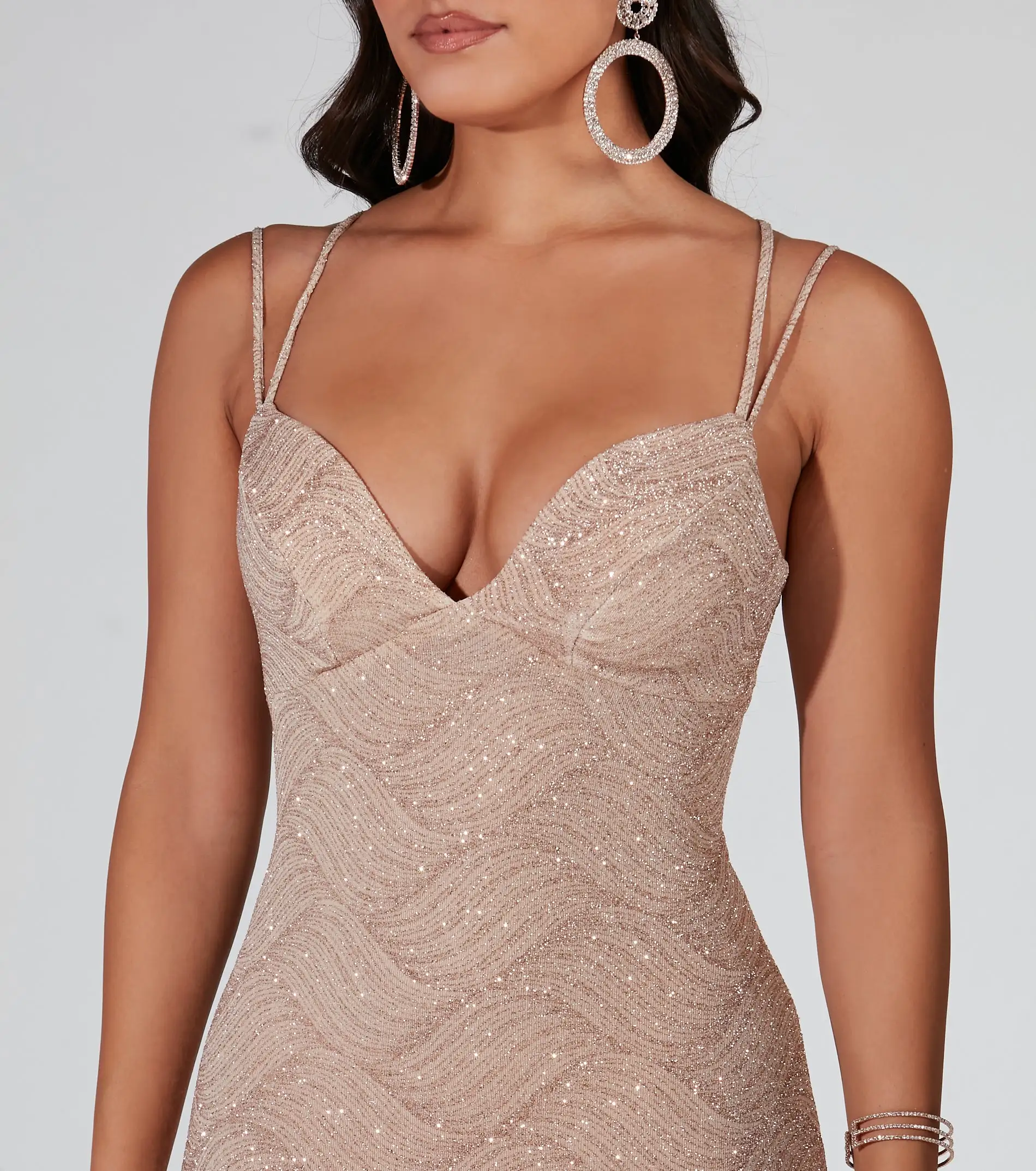 Stun in a formal dress that makes your entrance that much more glitzy! Romy features a beautiful glitter knit body that shimmers from all your best angles, a sleeveless V-neckline with padded cups, adjustable spaghetti straps, and a sexy lace-up back supported with flexible boning. Her slim-fit waist leads to an enchanting mermaid silhouette accented with a gorgeous train. She is composed of a lined glitter knit fabric that offers a form hugging fit with a moderate stretch. Complete look with