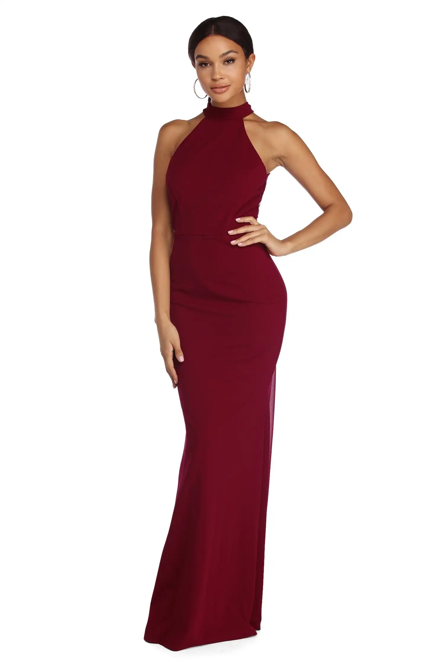 You’re a one of a kind type of beauty, radiate that confidence in our Roseanne burgundy dress! She features a high round neckline with a racer bust, padded cups and princess seams. Her back features a two button closure at the nape of the neck, an open back with unlined scalloped lace trim and a row of rosette accents with a sheer chiffon train. Her slim fit bodice leads to a floor length silhouette. Dress is composed of a burgundy hued chiffon fabric that offers a relaxed fit with minimal stretch.