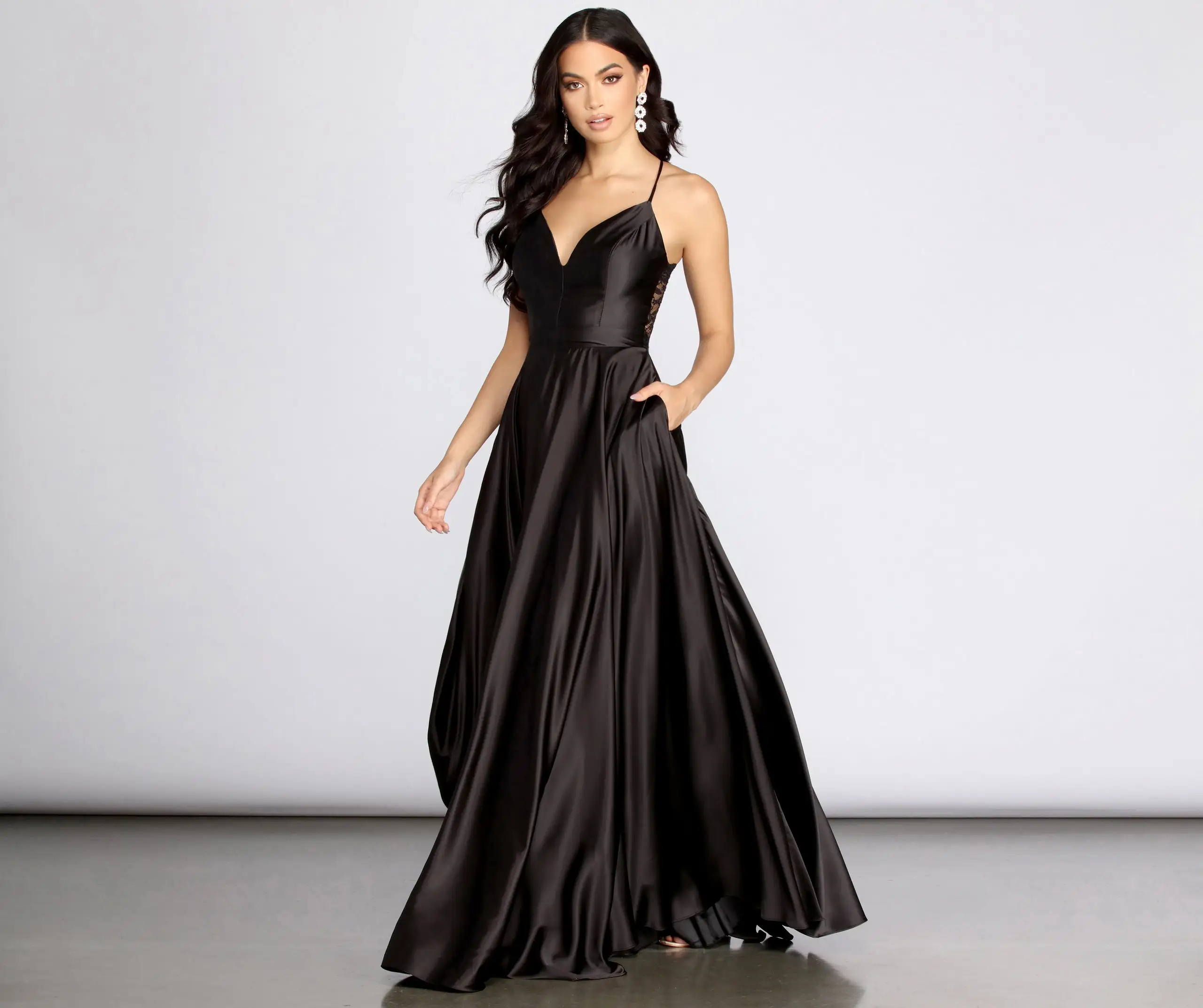 Elegant, sleek, and practical are the definition of our Rowanne gown. With a lustrous satin finish and an elegant lace back, you’ll be happy to know she even has pockets for storing your necessities!Â